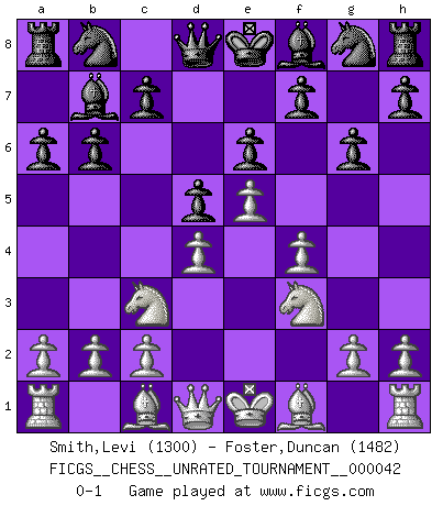 Last move : 0-1 2015 August 2 7:42:27 [Event "FICGS__CHESS__UNRATED_TOURNAMENT__000042"] [Site "FICGS"] [Date "2015.06.22"] [Round "1"] [White "Smith,Levi"] [Black "Foster,Duncan"] [Result "0-1"] [WhiteElo "1300"] [BlackElo "1482"] 1.e4 e6 2.d4 b6 3.f4 Bb7 4.Nc3 a6 5.Nf3 g6 6.e5 d5 0-1 This chess game has been lost on time (started : 2015.06.22 17:51:56) French defense Player Black won this chess game. Follow this game move after move (download)Openings teach you openings. Endgames teach you chess ! (Stephan Gerzadowicz) Schach ist die gewalttätigste aller Sportarten. (Garry Kasparov) Yo no creo en la psicología. Yo creo en las buenas movidas. (Bobby Fischer) Shah mat. Le roi est mort. Cri de fierté d'un joueur venant de terrasser son adversaire, courtoisement, sans effusion de sang. Logic : The art of thinking and reasoning in strict accordance with the limitations and incapacities of the human misunderstanding. (Ambrose Bierce)