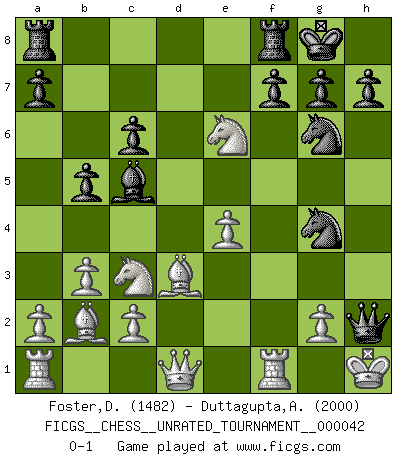 Last move : 0-1 2015 June 26 5:11:42 [Event "FICGS__CHESS__UNRATED_TOURNAMENT__000042"] [Site "FICGS"] [Date "2015.06.22"] [Round "1"] [White "Foster,Duncan"] [Black "Duttagupta,Aniruddha"] [Result "0-1"] [WhiteElo "1482"] [BlackElo "2000"] 1.e4 c6 2.d4 d5 3.Nc3 dxe4 4.f3 Qb6 5.fxe4 e5 6.dxe5 Be6 7.Nf3 Nd7 8.Bd3 Ne7 9.b3 Ng6 10.Na4 Qc7 11.Bb2 Ndxe5 12.O-O b5 13.Nc3 Bc5+ 14.Kh1 O-O 15.Ng5 Ng4 16.Nxe6 Qxh2+ 0-1 Caro-Kann : Rasa-Studier gambit Kingside Castling by player White (move 12) Kingside Castling by player Black (move 14) Player Black won this chess game. Follow this game move after move (download)One of these modest little moves may be more embarrassing to your opponent than the biggest threat. (Siegbert Tarrasch) Die Jungen erwarten, dass Opa einfach umfällt. Dann aber kann Opa fünf Stunden lang Schach spielen und die jungen Gegner an die Wand drücken. (Viktor Kortschnoi) Existen dos clases de sacrificios: los correctos y los míos. (Mikhail Tal) Vous n'êtes pas toujours obligé de jouer le meilleur coup. Un coup doit être actif, entreprenant, correct et beau ! (David Bronstein) Plans are ideas that never come to fruition. (Daniel Parmet)