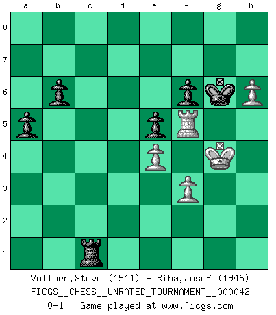 Last move : 0-1 2015 September 7 17:32:37 [Event "FICGS__CHESS__UNRATED_TOURNAMENT__000042"] [Site "FICGS"] [Date "2015.06.22"] [Round "1"] [White "Vollmer,Steve"] [Black "Riha,Josef"] [Result "0-1"] [WhiteElo "1511"] [BlackElo "1946"] 1.d4 Nf6 2.Nf3 d5 3.e3 e6 4.c4 c6 5.Bd3 Bd6 6.O-O O-O 7.Nc3 Nbd7 8.b3 b6 9.Bb2 Bb7 10.Rc1 Rc8 11.Qe2 Re8 12.Rfd1 a5 13.h3 Qe7 14.g4 Ba3 15.Nh2 Bxb2 16.Qxb2 c5 17.Bf1 cxd4 18.Rxd4 e5 19.R4d1 dxc4 20.Bxc4 Nb8 21.Nd5 Nxd5 22.Bxd5 Rxc1 23.Qxc1 Rc8 24.Qd2 Bxd5 25.Qxd5 Qf6 26.Qd6 Qxd6 27.Rxd6 Rc1+ 28.Kg2 Nc6 29.Nf3 f6 30.g5 Kf7 31.gxf6 gxf6 32.Rd7+ Ne7 33.Rb7 Rc6 34.h4 Rd6 35.a4 h5 36.Ng1 Ke8 37.e4 Ng6 38.Kg3 Rd3+ 39.f3 Rxb3 40.Ne2 Rb2 41.Rg7 Rxe2 42.Rxg6 Kf7 43.Rh6 Kg7 44.Rxh5 Ra2 45.Rf5 Rxa4 46.h5 Rc4 47.h6+ Kg6 48.Kg4 Rc1 0-1 Queen's pawn game Kingside Castling by player White (move 6) Kingside Castling by player Black (move 6) Player Black won this chess game. Follow this game move after move (download)White lost because he failed to remember the right continuation and had to think up the moves himself. (Siegbert Tarrasch) Der beste Spieler in einem Turnier gewinnt es nie. Er landet auf Platz zwei oder drei. (Siegbert Tarrasch) Buenas posiciones no logran ganar juegos, buenas movidas sí. (Gerald Abrahams) Que feriez-vous si vous étiez en train de jouer aux échecs et que la fin du monde arrive ? Je continuerais à jouer. (Saint Borromée) Statistics can be made to prove anything - even the truth. (Author unknown)