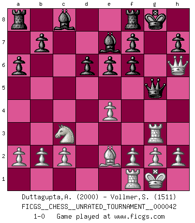 Last move : 1-0 2015 June 23 16:42:14 [Event "FICGS__CHESS__UNRATED_TOURNAMENT__000042"] [Site "FICGS"] [Date "2015.06.22"] [Round "1"] [White "Duttagupta,Aniruddha"] [Black "Vollmer,Steve"] [Result "1-0"] [WhiteElo "2000"] [BlackElo "1511"] 1.e4 c5 2.Nf3 d6 3.d4 cxd4 4.Nxd4 Nc6 5.Nc3 Nf6 6.Bg5 a6 7.Be2 e6 8.Qd2 Be7 9.O-O Qc7 10.Rad1 O-O 11.Bxf6 gxf6 12.Qh6 Nxd4 13.Rxd4 Qc5 14.Rd3 Qg5 15.Rg3 1-0 Sicilian Kingside Castling by player White (move 9) Kingside Castling by player Black (move 10) Player White won this chess game. Follow this game move after move (download)I like to say that Bobby Fischer was the greatest player ever. But what made Fischer a genius was his ability to blend an American freshness and pragmatism with Russian ideas about strategy. (Bruce Pandolfini) Jeder Schachmeister war einmal ein Anfänger. (Irving Chernev) Una buena memoria, concentración, imaginación y una fuerte voluntad, se requiere para llegar a ser un buen jugador. (Bobby Fischer) Le système Elo représente seulement une moyenne. Il est simplement un indicateur de votre stabilité. (Anatoli Karpov) Excelling at chess has long been considered a symbol of more general intelligence. That is an incorrect assumption in my view, as pleasant as it might be. But for the purposes of argument and investigation, chess is, in Russkin-Gutman's words, 'an unparalleled laboratory, since both the learning process and the degree of ability obtained can be objectified and quantified, providing an excellent comparative framework on which to use rigorous analytical techniques.' (The Chess Master and the Computer, by Garry Kasparov - 2010)