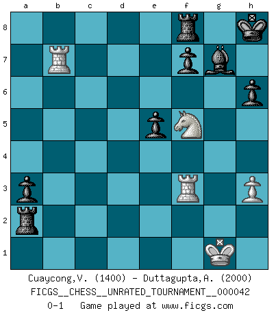 Last move : 0-1 2015 July 27 14:21:23 [Event "FICGS__CHESS__UNRATED_TOURNAMENT__000042"] [Site "FICGS"] [Date "2015.06.22"] [Round "1"] [White "Cuaycong,Virgilio"] [Black "Duttagupta,Aniruddha"] [Result "0-1"] [WhiteElo "1400"] [BlackElo "2000"] 1.e4 c5 2.Nf3 d6 3.d4 cxd4 4.Nxd4 Nf6 5.Nc3 a6 6.Bg5 e6 7.f4 Qb6 8.Qd2 Qxb2 9.Rb1 Qa3 10.e5 h6 11.Bh4 dxe5 12.fxe5 g5 13.exf6 gxh4 14.Be2 Qa5 15.O-O Nd7 16.Kh1 Qg5 17.Qd3 Nxf6 18.Bf3 Bg7 19.Bxb7 Bxb7 20.Rxb7 O-O 21.Nc6 Qc5 22.Ne7+ Kh8 23.Ne4 Nxe4 24.Qxe4 Rab8 25.Rd7 h3 26.gxh3 Rbd8 27.Rb7 Bf6 28.Nc6 Rd2 29.Qf3 Bg7 30.Ne7 Qxc2 31.Qf4 Rg2 32.Rb4 a5 33.Rb5 Qe2 34.R5b1 e5 35.Qf3 Rxh2+ 36.Kg1 Qxf3 37.Rxf3 Rxa2 38.Nf5 a4 39.Rb7 a3 0-1 Sicilian : Najdorf, 7...Qb6 Kingside Castling by player White (move 15) Kingside Castling by player Black (move 20) Player Black won this chess game. Follow this game move after move (download)Tactics flow from a superior position. (Bobby Fischer) Schach ist gnadenlos. Du mußt bereit sein zu töten. (Nigel Short) Después de la respuesta de las negras a 1.e4 con 1..e5, se quedan siempre tratando de entrar dentro del juego. (Howard Staunton) Dans le domaine de la peinture, de la gravure et de la sculpture, dès la première décennie de notre siècle, les artistes abandonnent la représentation de la partie d'échecs pour se concentrer sur les pièces, sur les échiquiers et sur toutes les variations auxquelles les unes et les autres peuvent donner lieu. On passe en quelque sorte d'un thème social à un thème musical (au sens de la musica médiévale, c'est-à-dire d'une notion qui inclue le rythme, l'harmonie, la construction et la déconstruction, etc.). Graphiquement et picturalement, l'échiquier apparaît comme une structure ouverte, dynamique, d'une richesse infinie, autorisant toutes les combinatoires et débouchant sur des mouvements et des rythmes de nature exponentielle. (Michel Pastoureau) The absolute truth is the thing that makes people laugh. (Carl Reiner)