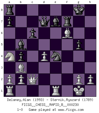 Last move : 1-0 2015 August 3 23:5:53 [Event "FICGS__CHESS__RAPID_B__000230"] [Site "FICGS"] [Date "2015.06.23"] [Round "1"] [White "Delaney,Alan"] [Black "Sternik,Ryszard"] [Result "1-0"] [WhiteElo "1993"] [BlackElo "1789"] 1.d4 d5 2.c4 c6 3.Nf3 Nf6 4.Nc3 e6 5.Bg5 h6 6.Bh4 dxc4 7.e4 g5 8.Bg3 b5 9.Be2 Bb7 10.O-O Nbd7 11.Ne5 Be7 12.f4 b4 13.fxg5 hxg5 14.Na4 O-O 15.Bxc4 Nxe4 16.Nxf7 Rxf7 17.Bxe6 Ndf6 18.Be5 Ba6 19.Re1 Qe8 20.Bb3 Bb5 21.Qc2 Qd7 22.Bxf6 1-0 QGD Slav : 4.Nc3 Kingside Castling by player White (move 10) Kingside Castling by player Black (move 14) Player White won this chess game. Follow this game move after move (download)No one ever won a game by resigning. (Unknown) Der Schachmeister von Heute braucht Courage, einen Killerinstinkt, Ausdauer und Arroganz. (Larry Evans) Las ideas audaces son como las piezas del Ajedrez que avanzan hacia adelante. Ellas pueden ser vencidas, pero también pueden iniciar una partida victoriosa. (Goethe) Les Echecs ne sont pas pour les âmes timides. Ils requièrent un homme entier, qui ne s'arrête pas aveuglément à ce qui a été déjà établi, mais qui tente individuellement de sonder les profondeurs du jeu. (W. Steinitz) Thibault, I ask for draw. Game 13876. - Sorry Ilmars, you won. (FICGS chat)
