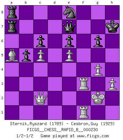 Last move : 1/2-1/2 2015 September 7 0:56:38 [Event "FICGS__CHESS__RAPID_B__000230"] [Site "FICGS"] [Date "2015.06.23"] [Round "1"] [White "Sternik,Ryszard"] [Black "Cesbron,Guy"] [Result "1/2-1/2"] [WhiteElo "1789"] [BlackElo "1929"] 1.e4 c6 2.d4 Na6 3.Nc3 Nc7 4.Bd3 g6 5.Nf3 d5 6.exd5 Nxd5 7.O-O Ngf6 8.Nxd5 Nxd5 9.c4 Nf6 10.Re1 Bg7 11.Bd2 O-O 12.Bc3 Qc7 13.Qd2 Bg4 14.Ne5 Be6 15.h3 Rfd8 16.Rad1 Ne8 17.Rc1 b6 18.Qe3 Rac8 19.Nf3 Qd7 20.Rcd1 Bf6 21.Ne5 Qc7 22.b3 Nd6 23.g4 b5 24.Rc1 Qb7 25.Ba5 Rf8 26.a4 a6 27.Rb1 Rb8 28.Rec1 Rfc8 29.f4 Qa7 30.c5 Ne8 31.axb5 axb5 32.Ra1 Bxe5 33.dxe5 Bxb3 34.f5 e6 35.fxg6 hxg6 36.Bxg6 fxg6 37.Qxb3 Qe7 38.Qc2 Kh7 39.Rf1 Ra8 40.Rf3 Rc7 41.Kg2 Rca7 42.Raf1 1/2-1/2 de Bruycker defense Kingside Castling by player White (move 7) Kingside Castling by player Black (move 11) This chess game ended in a draw. Follow this game move after move (download)I have added these principles to the law: get the Knights into action before both Bishops are developed. (Emanuel Lasker) Im Schach gewinnt jeder. Hat man Freunde am Spiel - und das ist die Hauptsache - ist auch der Verlust einer Partie kein Unglück. (David Bronstein) Mis oponentes también hacen buenas movidas. A veces yo no tomo esas cosas en consideración. (Bobby Fischer) Comme les marins qui ont mille raisons différentes d'aller en mer, les joueurs d'échecs en ont tout autant avant de s'installer devant une table et jouer... (Vincent Bertignac, philosophe) I teach you to lie, cheat and steal, and as soon as my back's turned you wait in line ? (Gregory House, House M.D.)