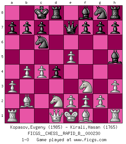 Last move : 1-0 2015 August 19 21:17:43 [Event "FICGS__CHESS__RAPID_B__000230"] [Site "FICGS"] [Date "2015.06.23"] [Round "1"] [White "Kopasov,Evgeny"] [Black "Kirali,Hasan"] [Result "1-0"] [WhiteElo "1985"] [BlackElo "1765"] 1.d4 d5 2.c4 e5 3.dxe5 d4 4.Nf3 Nc6 5.a3 Bg4 6.Nbd2 Qe7 7.h3 Bh5 8.b4 O-O-O 9.Bb2 1-0 This chess game has been lost on time (started : 2015.06.23 7:37:33) QGD : Albin counter-gambit Queenside Castling by player Black (move 8) Player White won this chess game. Follow this game move after move (download)Later, I began to succeed in decisive games. Perhaps because I realized a very simple truth: not only was I worried, but also my opponent. (Mikhail Tal) Stil? Ich habe keinen Stil! (Anatoly Karpov) Una mala movida nulifica cuarenta buenas. (Horowitz) Shah mat. Le roi est mort. Cri de fierté d'un joueur venant de terrasser son adversaire, courtoisement, sans effusion de sang. This is where the fun begins. (Anakin Skywalker in Star Wars ep.3)