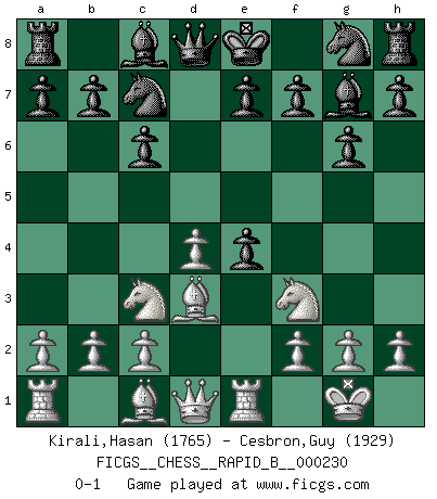 Last move : 0-1 2015 August 20 21:22:26 [Event "FICGS__CHESS__RAPID_B__000230"] [Site "FICGS"] [Date "2015.06.23"] [Round "1"] [White "Kirali,Hasan"] [Black "Cesbron,Guy"] [Result "0-1"] [WhiteElo "1765"] [BlackElo "1929"] 1.e4 c6 2.d4 Na6 3.Nf3 Nc7 4.Bd3 d5 5.Nc3 g6 6.O-O Bg7 7.Re1 dxe4 0-1 This chess game has been lost on time (started : 2015.06.23 7:37:33) Caro-Kann defense Kingside Castling by player White (move 6) Player Black won this chess game. Follow this game move after move (download)Some sacrifices are sound; the rest are mine. (Mikhail Tal) Du musst nicht gut spielen, es reicht, wenn du besser spielst als dein Gegner. (Anonymous) Todos los Maestros de Ajedrez fueron un día unos principiantes. (Chernev) RxDa4 pat (...) Every vice is only an exaggeration of a necessary and virtuous function. (Ralph Waldo Emerson, Journals 1936)
