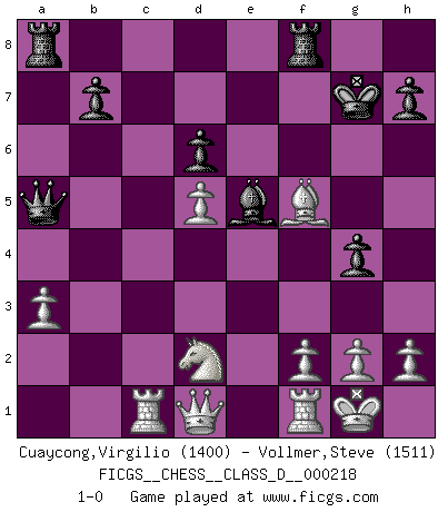 Last move : 1-0 2015 July 22 15:32:48 [Event "FICGS__CHESS__CLASS_D__000218"] [Site "FICGS"] [Date "2015.06.23"] [Round "1"] [White "Cuaycong,Virgilio"] [Black "Vollmer,Steve"] [Result "1-0"] [WhiteElo "1400"] [BlackElo "1511"] 1.e4 Nf6 2.e5 Nd5 3.d4 d6 4.Nf3 e6 5.c4 Nb6 6.exd6 cxd6 7.Nc3 Be7 8.Bd3 O-O 9.O-O Nc6 10.Re1 Bd7 11.Be3 f5 12.a3 g5 13.d5 exd5 14.Bxb6 axb6 15.cxd5 Na5 16.Rc1 b5 17.Nxb5 Bxb5 18.Bxb5 Bf6 19.b4 g4 20.Nd2 Qb6 21.Bd7 Bd4 22.Be6+ Kg7 23.Rf1 Be5 24.bxa5 Qxa5 25.Bxf5 1-0 Alekhine's defense : Modern variation Kingside Castling by player Black (move 8) Kingside Castling by player White (move 9) Player White won this chess game. Follow this game move after move (download)Fischer Chess play was always razor-sharp, rational and brilliant. One of the best ever. (Dave Regis) Es gibt keine einzige Frau, der ich nicht einen Springer vorgeben könnte und trotzdem gewänne. (Robert James Fischer) Me dio la sensación de como si yo estuviera jugando en contra del mismo Ajedrez. - al estar jugando en contra de Robert Fischer (Walter Shipman) Les échecs sont utiles à l'exercice de la faculté de penser et à celle de l'imagination. Car nous devons posséder une méthode élaborée pour atteindre des buts partout où nous devons conduire notre raison. (Leibnitz) If you don't practice you don't deserve to win. (Andre Agassi)