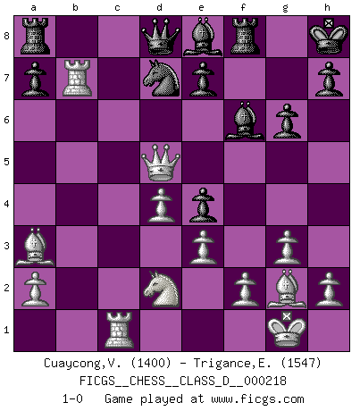 Last move : 1-0 2015 August 9 7:12:32 [Event "FICGS__CHESS__CLASS_D__000218"] [Site "FICGS"] [Date "2015.06.23"] [Round "1"] [White "Cuaycong,Virgilio"] [Black "Trigance,Emile"] [Result "1-0"] [WhiteElo "1400"] [BlackElo "1547"] 1.d4 f5 2.g3 Nf6 3.Bg2 g6 4.Nf3 Bg7 5.O-O O-O 6.c4 d6 7.Nc3 c6 8.Rb1 Ne4 9.Nxe4 fxe4 10.Nd2 d5 11.e3 Kh8 12.b4 Be6 13.b5 Nd7 14.bxc6 bxc6 15.Qa4 Qc7 16.Ba3 Bf6 17.cxd5 cxd5 18.Rfc1 Qd8 19.Qc6 Bf7 20.Rb7 Be8 21.Qxd5 1-0 Dutch defense Kingside Castling by player White (move 5) Kingside Castling by player Black (move 5) Player White won this chess game. Follow this game move after move (download)What is the object of playing a gambit opening?... To acquire a reputation of being a dashing player at the cost of losing a game. (Siegbert Tarrasch) Irgendwie scheint mir sonntags früh um 9 Uhr der Killerinstinkt verloren gegangen zu sein. (Alexej Shirov) Un jugador que es sorprendido, esta derrotado a medias. (Proverbio) Tout change constamment, y compris dans le monde des Echecs. (Botvinnik) When you stop learning you start dying. (Scott Adams)