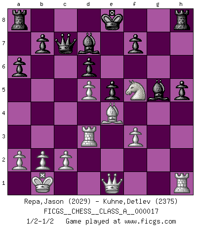 Last move : 1/2-1/2 2007 April 21 11:2:24 [Event "FICGS__CHESS__CLASS_A__000017"] [Site "FICGS"] [Date "2007.03.05"] [Round "1"] [White "Repa,Jason"] [Black "Kuhne,Detlev"] [Result "1/2-1/2"] [WhiteElo "2029"] [BlackElo "2375"] 1.e4 c5 2.Nf3 d6 3.d4 cxd4 4.Nxd4 Nf6 5.Nc3 a6 6.Be3 e6 7.g4 h6 8.Bg2 Nc6 9.h3 Ne5 10.Qe2 g5 11.O-O-O Qc7 12.Nf3 Nc4 13.Kb1 Nxe3 14.Qxe3 e5 15.Rd3 Be7 16.Nd5 Nxd5 17.exd5 Bd7 18.h4 gxh4 19.Nxh4 Bxg4 20.Be4 Bg5 21.Qe1 h5 22.f3 Bd7 23.Nf5 1/2-1/2 Sicilian : Najdorf, Byrne (English) attack Queenside Castling by player White (move 11) This chess game ended in a draw. Follow this game move after move (download)Avoid the crowd. Do your own thinking independently. Be the Chess player, not the Chess piece. (Ralph Charell) Der 70jährige Viktor Kortschnoi: Die Rentenanstalt wollte mich zwingen in Rente zu gehen. Meine Frau erhält jetzt eine Pension- und ich zahle weiter in die Rentenkasse ein! (Viktor Kortschnoi) Ayuda a tus piezas para que ellas te puedan ayudar. (Paul Morphy) Il n'y a pas eu de défaite parce que je ne crois pas que cet ordinateur ait jamais existé. IBM a triché en refusant d'imprimer les modes de recherche de la machine. C'est évident, pendant le match, des coups décisifs ont été joués par des êtres humains. Aujourd'hui, les meilleurs spécialistes en informatique ne peuvent toujours pas expliquer comment Deep-Blue a pu jouer contre la logique des ordinateurs. IBM a gagné une guerre de communication, mais ils sont incapables de prouver que l'ordinateur a gagné tout seul. (Garry Kasparov) How many people work in NATO Headquarters ? - About half of them. (Dirk Stikker, NATO general secretary)