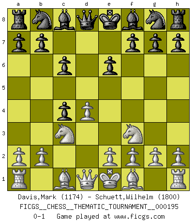 Last move : 0-1 2015 August 7 8:20:39 [Event "FICGS__CHESS__THEMATIC_TOURNAMENT__000195"] [Site "FICGS"] [Date "2015.06.27"] [Round "1"] [White "Davis,Mark"] [Black "Schuett,Wilhelm"] [Result "0-1"] [WhiteElo "1174"] [BlackElo "1800"] 1.d4 d5 2.c4 e6 3.Nc3 c6 4.Nf3 dxc4 0-1 This chess game has been lost on time (started : 2015.06.27 20:40:49) QGD : Semi-Slav, Noteboom variation Player Black won this chess game. Follow this game move after move (download)Whoever sees no other aim in the game than that of giving checkmate to one's opponent will never become a good Chess player. (Euwe) Ich spiele ehrlich und spiele, um zu gewinnen. Wenn ich verliere nehme ich meine Medizin. (Robert James Fischer) Con o sin el título, Bobby Fischer fue sin lugar a dudas el mas grande jugador de su época. (Burt Hochberg) Des idées, des idées, j'en ai cent, j'en ai mille. Des bonnes, des mauvaises, applicables, irréalisables... Il suffit de faire le tri ! (Roos) In fact if nothing is done against this teddy bear, hereby I announce that I would quit chess, rapid chess, blitz chess, postal chess, email chess, server chess and correspondence chess I will then switch to a table game where teddy bears aren't going to be seen for a while, like Poker, or Roulette, all 18+ games. (Elmer Valderrama)