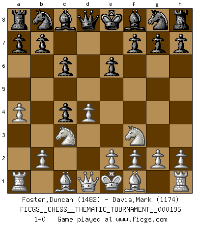 Last move : 1-0 2015 August 7 20:19:54 [Event "FICGS__CHESS__THEMATIC_TOURNAMENT__000195"] [Site "FICGS"] [Date "2015.06.27"] [Round "1"] [White "Foster,Duncan"] [Black "Davis,Mark"] [Result "1-0"] [WhiteElo "1482"] [BlackElo "1174"] 1.d4 d5 2.c4 e6 3.Nc3 c6 4.Nf3 dxc4 5.a4 1-0 This chess game has been lost on time (started : 2015.06.27 20:40:49) QGD : Semi-Slav, Noteboom variation Player White won this chess game. Follow this game move after move (download)The Pin is mightier than the sword. (Fred Reinfeld) Wer nie einen Fehler gemacht hat, hat nie etwas Neues ausprobiert. (Albert Einstein) Aquel que ve no otra dirección en el juego que la de dar Jaque Mate a su oponente, nunca será un buen jugador de Ajedrez. (Euwe) Les échecs sont un jeu par leur forme, un art par leur essence et une science par sa difficulté d'acquisition. Ils peuvent vous procurer autant de plaisir qu'un bon livre ou une belle musique, mais vous n'aurez une réelle joie que si vous arrivez à bien jouer. (Tigran Petrosian) Don't be discouraged. It's often the last key in the bunch that opens the lock. (Author unknown)