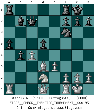 Last move : 0-1 2015 July 3 21:9:53 [Event "FICGS__CHESS__THEMATIC_TOURNAMENT__000195"] [Site "FICGS"] [Date "2015.06.27"] [Round "1"] [White "Sternik,Ryszard"] [Black "Duttagupta,Aniruddha"] [Result "0-1"] [WhiteElo "1789"] [BlackElo "2000"] 1.d4 d5 2.c4 e6 3.Nc3 c6 4.Nf3 dxc4 5.a4 Bb4 6.e3 b5 7.Bd2 a5 8.axb5 Bxc3 9.Bxc3 cxb5 10.b3 Bb7 11.bxc4 b4 12.Bb2 Nf6 13.Bd3 O-O 14.O-O Nbd7 15.Nd2 Qc7 16.d5 exd5 17.Bxf6 Nxf6 0-1 QGD : Semi-Slav, Abrahams variation Kingside Castling by player Black (move 13) Kingside Castling by player White (move 14) Player Black won this chess game. Follow this game move after move (download)You know you're going to lose. Even when I was ahead I knew I was going to lose. - On playing against Fischer. (Andrew Soltis) Privat ist Kortschnoi kein schlechter Mensch, sehr sympathisch. Aber während des Spiels ist er grausam. Er will dich töten. (Miguel Najdorf) Cada Peón es potencialmente una Reina. (James Mason) Même si vous avez un bon coup à faire, regardez toujours s'il n'y en a pas un qui lui soit préférable. (Pedro Damiano) Yoga is 99% practice and 1% knowledge. (Sri Krishna Pattabhi Jois)