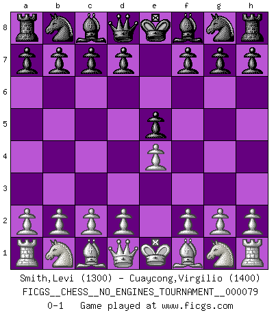 Last move : 0-1 2015 August 7 20:19:54 [Event "FICGS__CHESS__NO_ENGINES_TOURNAMENT__000079"] [Site "FICGS"] [Date "2015.06.27"] [Round "1"] [White "Smith,Levi"] [Black "Cuaycong,Virgilio"] [Result "0-1"] [WhiteElo "1300"] [BlackElo "1400"] 1.e4 e5 0-1 This chess game has been lost on time (started : 2015.06.27 22:25:56) King's pawn game Player Black won this chess game. Follow this game move after move (download)Fischer Chess play was always razor-sharp, rational and brilliant. One of the best ever. (Dave Regis) Mit Schach schule ich mein Gefühl für Geometrie, was für Tennis und Schach gleichermaßen wichtig ist. (Boris Becker) Vive, pierde y aprende al observar a tu oponente como ganar. (Amber Steenbock) L'attaque fait le spectacle, la défense gagne les matchs. (Dicton footballistique) Hold em is to stud what chess is to checkers. (Johnny Moss)