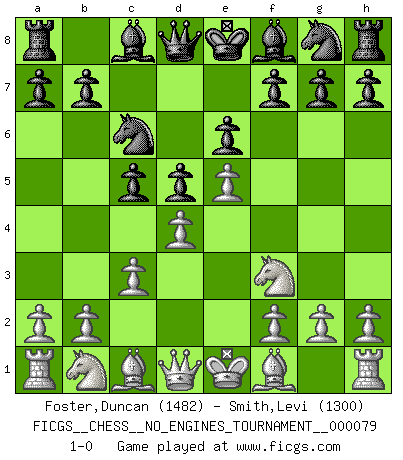 Last move : 1-0 2015 August 7 20:19:54 [Event "FICGS__CHESS__NO_ENGINES_TOURNAMENT__000079"] [Site "FICGS"] [Date "2015.06.27"] [Round "1"] [White "Foster,Duncan"] [Black "Smith,Levi"] [Result "1-0"] [WhiteElo "1482"] [BlackElo "1300"] 1.e4 e6 2.d4 d5 3.e5 c5 4.c3 Nc6 5.Nf3 1-0 This chess game has been lost on time (started : 2015.06.27 22:25:56) French : Advance, Paulsen attack Player White won this chess game. Follow this game move after move (download)I am the best player in the world and I am here to prove it. (Bobby Fischer) Besser ein falscher Plan, logisch durchgeführt, als gar kein Plan. (Viktor Kortschnoi) Botvinnik trató de alejar el misterio referente al Ajedrez, siempre relacionandolo a situaciones de la vida diaria. Solía llamar al Ajedrez un problema inexacto típico, similar a aquellos en que la gente tiene siempre que resolver a cada día. (Garry Kasparov) Les réformistes prétendent que les progrès de la théorie conduiront à la disparition des échecs, et qu'il faut, pour leur rendre vie, en remanier les règles. En réalité, qu'exprime cette affirmation? Le mépris de l'intuition, de l'imagination et de tous les autres éléments qui font des échecs un art. (Alexander Alekhine) Fear is the path to the dark side. Fear leads to anger; anger leads to hate; hate leads to suffering. I sense much fear in you. (Master Yoda in Star Wars ep.1)