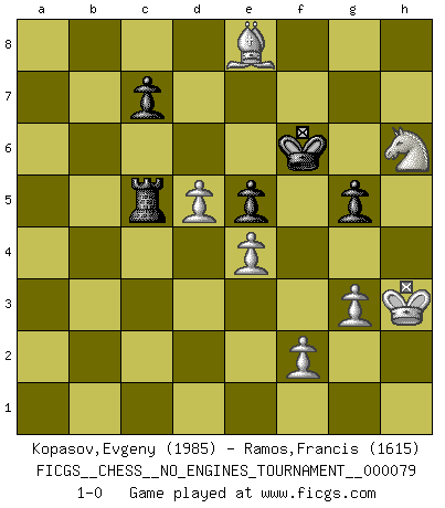 Last move : 1-0 2015 July 31 16:31:30 [Event "FICGS__CHESS__NO_ENGINES_TOURNAMENT__000079"] [Site "FICGS"] [Date "2015.06.27"] [Round "1"] [White "Kopasov,Evgeny"] [Black "Ramos,Francis"] [Result "1-0"] [WhiteElo "1985"] [BlackElo "1615"] 1.d4 Nf6 2.c4 g6 3.Nc3 Bg7 4.e4 d6 5.Nf3 O-O 6.Be2 e5 7.O-O Nc6 8.d5 Ne7 9.b4 Nd7 10.a4 a5 11.Ba3 axb4 12.Bxb4 b6 13.a5 bxa5 14.Bxa5 Ba6 15.Qc2 Nc5 16.Bb4 Nd7 17.Ra2 Nb6 18.Rfa1 Bb7 19.Rxa8 Bxa8 20.c5 dxc5 21.Bxc5 Nd7 22.Rxa8 Qxa8 23.Bxe7 Rb8 24.Na4 Qa5 25.g3 Ra8 26.Bd1 h6 27.Kg2 Nb6 28.Nxb6 Qxb6 29.Bc5 Qa5 30.Be3 Qa1 31.Be2 Ra2 32.Qd1 Qb2 33.Bc4 Ra1 34.Qb3 Rb1 35.Qxb2 Rxb2 36.h4 Kf8 37.h5 Rc2 38.Bb5 Ke7 39.hxg6 fxg6 40.Nh4 Kf6 41.Be8 g5 42.Nf5 Bf8 43.Kh3 Bc5 44.Bxc5 Rxc5 45.Nxh6 1-0 King's Indian : Orthodox, Aronin-Taimanov variation (Yugoslav attack / Mar del Plata variation) Kingside Castling by player Black (move 5) Kingside Castling by player White (move 7) Player White won this chess game. Follow this game move after move (download)It began to feel as though you were playing against Chess itself. - On playing against Robert Fischer. (Walter Shipman) Ohne ihre Erfolge schmälern zu wollen würde ich sagen Petrosian, Spassky und Karpov verdanken ihre Siege ihren Trainern - Boleslavsky, Bondarevsky und Furman. (Mikhail Moiseyevich Botvinik) El Ajedrez no es una pizca de inferior al violín, y tenemos un gran número de violinistas profesionales. (Mikhail Botvinnik) Des idées, des idées, j'en ai cent, j'en ai mille. Des bonnes, des mauvaises, applicables, irréalisables... Il suffit de faire le tri ! (Roos) Happy endings are just stories that haven't finished yet. (Jane Smith in Mr & Mrs Smith)