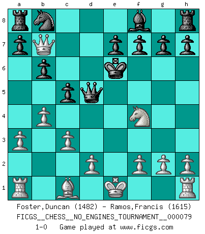 Last move : 1-0 2015 July 1 18:10:4 [Event "FICGS__CHESS__NO_ENGINES_TOURNAMENT__000079"] [Site "FICGS"] [Date "2015.06.27"] [Round "1"] [White "Foster,Duncan"] [Black "Ramos,Francis"] [Result "1-0"] [WhiteElo "1482"] [BlackElo "1615"] 1.e4 c5 2.a3 d6 3.b4 b6 4.Nc3 Nf6 5.e5 dxe5 6.Qf3 e4 7.Nxe4 Qd4 8.Nxf6+ Qxf6 9.Bb5+ Bd7 10.Bxd7+ Kxd7 11.Qb7+ Ke6 12.c3 Qe5+ 13.Ne2 Qd5 14.Nf4+ 1-0 Duncan Foster Hello Francis, thanks for the game. could it be that 4...Nf6 was the movethat created weakness in your position? Scott Nichols Yes, my engine said the same thing. Sicilian defense Player White won this chess game. Follow this game move after move (download)Up to this point White has been following well-known analysis. But now he makes a fatal error: he begins to use his own head. (Siegbert Tarrasch) Wenn ein Kopf und ein Buch zusammenstoßen und es klingt hohl, ist es denn allemal im Buche? (Georg Christoph Lichtenberg) El Ajedrez es tan inspirador que yo no creo que un buen jugador sea capaz de tener un pensamiento malo durante una partida. (Wilhelm Steinitz) Toutes choses étant égales, c'est la conviction qui gagne. Alliée à une volonté de vaincre, elle sert de détonateur, suscite des idées, disperse les doutes et aide à penser clairement. (Robert Fischer) In my experience, there's no such thing as luck. (Obi-Wan Kenobi in Star Wars ep.4)
