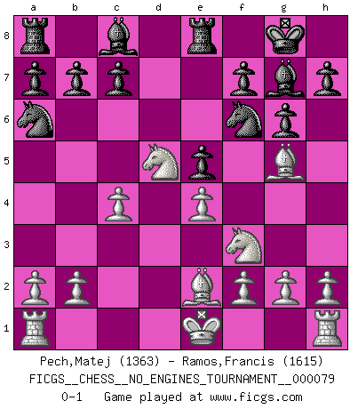 Last move : 0-1 2015 September 17 15:10:47 [Event "FICGS__CHESS__NO_ENGINES_TOURNAMENT__000079"] [Site "FICGS"] [Date "2015.06.27"] [Round "1"] [White "Pech,Matej"] [Black "Ramos,Francis"] [Result "0-1"] [WhiteElo "1363"] [BlackElo "1615"] 1.d4 Nf6 2.c4 g6 3.Nc3 Bg7 4.e4 d6 5.Nf3 O-O 6.Be2 e5 7.dxe5 dxe5 8.Qxd8 Rxd8 9.Bg5 Re8 10.Nd5 Na6 0-1 King's Indian : Andersson variation Kingside Castling by player Black (move 5) Player Black won this chess game. Follow this game move after move (download)You are for me the Queen on d8 and I am the Pawn on d7 !! (Eduard Gufeld) Der Knackpunkt bei der Konzentration ist, daß wir nur durch sie etwas Neues und Ungewöhnliches am Schachbrett finden können. Sie ist der einzige Weg durch neue neue Ideen eine Überraschung zu bereiten. (Garry Kasparov) ¡Examina movidas que hagan daño! Un buen ojo for movidas desvastantes es mucho mas importante que el conocimiento de principios estratégicos. (Purdy) Un millionnaire : 'Monsieur Steinitz ! Vous ne participez aux tournois que pour l'argent, alors que moi je n'y viens que pour l'honneur.' Steinitz : 'Chacun joue pour ce qu'il n'a pas'... Unless I accept my faults I will most certainly doubt my virtues. (Hugh Prather)