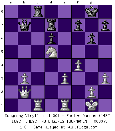 Last move : 1-0 2015 August 6 12:50:52 [Event "FICGS__CHESS__NO_ENGINES_TOURNAMENT__000079"] [Site "FICGS"] [Date "2015.06.27"] [Round "1"] [White "Cuaycong,Virgilio"] [Black "Foster,Duncan"] [Result "1-0"] [WhiteElo "1400"] [BlackElo "1482"] 1.f4 b6 2.Nf3 Bb7 3.e3 g6 4.d4 Bg7 5.c3 d6 6.Bd3 e6 7.O-O Ne7 8.Qe2 O-O 9.Nbd2 a6 10.Re1 Nd7 11.a3 c5 12.b3 Qc7 13.Bb2 b5 14.a4 b4 15.cxb4 cxb4 16.Rac1 Qb6 17.Nc4 Qc7 18.h3 Nf6 19.a5 Rad8 20.Nb6 Nc6 21.Bxa6 Nd7 22.Nxd7 Rxd7 23.Bb5 Rc8 24.d5 Bxb2 25.Qxb2 exd5 26.Nd4 Qxa5 27.Bxc6 Bxc6 28.Nxc6 Qa6 29.Nxb4 Qb7 30.Nxd5 1-0 Bird's Opening Kingside Castling by player White (move 7) Kingside Castling by player Black (move 8) Player White won this chess game. Follow this game move after move (download)The hallmark of the artist is simplicity. (Larry Evans) Mein erstes Ziel war nicht, die Partie zu gewinnen, sondern eine Figur zu opfern. -- der junge (Wilhelm Steinitz) Observen a Garry Kasparov. Después de una derrota, invariablemente el gana la próxima partida. Prácticamente hace pedazos a su siguiente oponente. Eso es algo que tenemos que aprender a lograr. (Maurice Ashley) Le jeu d'échecs fait naître et fortifie en nous plusieurs qualités précieuses dans le cours de l'existence, telles que la prévoyance, la circonspection, la prudence, et la persévérance. (Benjamin Franklin - 1783, la morale des échecs) Life is the sum of all your choices. (Albert Camus)