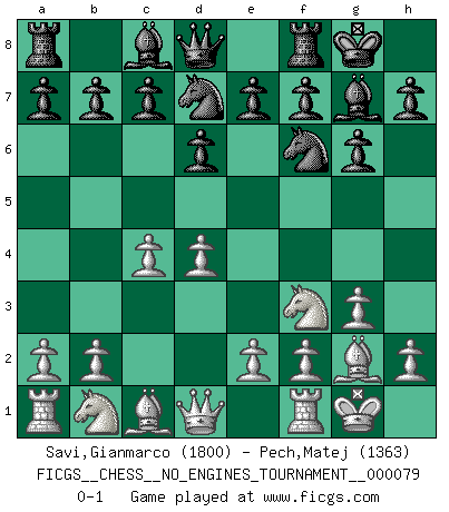 Last move : 0-1 2015 September 5 22:32:31 [Event "FICGS__CHESS__NO_ENGINES_TOURNAMENT__000079"] [Site "FICGS"] [Date "2015.06.27"] [Round "1"] [White "Savi,Gianmarco"] [Black "Pech,Matej"] [Result "0-1"] [WhiteElo "1800"] [BlackElo "1363"] 1.Nf3 Nf6 2.g3 g6 3.Bg2 Bg7 4.c4 O-O 5.d4 d6 6.O-O Nbd7 0-1 This chess game has been lost on time (started : 2015.06.27 22:25:56) Reti : King's Indian attack Kingside Castling by player Black (move 4) Kingside Castling by player White (move 6) Player Black won this chess game. Follow this game move after move (download)Dazzling combinations are for the many, shifting wood is for the few. (Georg Kieninger) Schach ist das Spiel, das die Verrückten gesund hält. (Albert Einstein) Si pudieramos observar el interior de la cabeza de un jugador de Ajedrez, encontraríamos ahí un mundo lleno de sentimientos, imágenes, ideas, emoción y pasión. (Alfred Binet) Horreur, mais aussi harmonie suprême : qu'y avait-il en effet au monde en dehors des échecs ? Le brouillard, l'inconnu, le non-être... (Vladimir Nabokov) Games, world of games... There's always an opponent, and there's always a victim. (Revolver, movie)