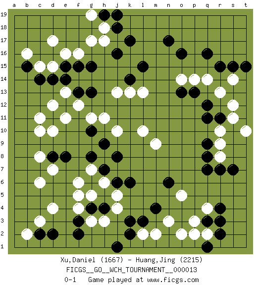 Last move : 0-1 2015 October 28 12:22:19 [Event "FICGS__GO__WCH_TOURNAMENT__000013"] [Site "FICGS"] [Date "2015.07.02"] [Round "1"] [Black "Xu,Daniel"] [White "Huang,Jing"] [Result "0-1"] [Rating 1 "1667"] [Rating 2 "2215"] 1.q16 d4 2.r4 d17 3.f3 c6 4.l3 r10 5.q9 r9 6.q8 r8 7.r7 r13 8.q7 p3 9.q3 n3 10.m4 q2 11.r2 q4 12.r3 o5 13.n6 l2 14.k2 m2 15.k3 o2 16.k17 c15 17.r15 d10 18.d2 c3 19.d11 c10 20.b15 b16 21.c14 d15 22.d14 c11 23.e15 e16 24.f15 f16 25.g15 h17 26.n17 f5 27.q12 s14 28.q11 s12 29.s15 q14 30.o13 e13 31.f13 f12 32.e12 e11 33.e14 d12 34.g13 h11 35.g6 g5 36.g8 h6 37.h7 f6 38.g10 g11 39.h9 j10 40.j6 g7 41.j8 j13 42.j16 l10 43.q1 p2 44.j18 h18 45.e8 d7 46.d8 c8 47.c2 b2 48.r11 s11 49.s7 t10 50.t15 j5 51.k6 h3 52.h4 g3 53.g4 f4 54.f2 j4 55.j1 o14 56.p13 p14 57.o16 m9 58.h19 g19 59.j19 g17 60.l15 l13 61.k14 k13 0-1 Here are the names of the openings (joseki) played in the four corners : Corner d4 : d4 f3 Hoshi (Hwajeom, Seongjeom, Xingwei`) 4-4 Point. The star or hoshi (4-4) point, emphasizing influence at the potential expense of territory. Ikken Kakari (Hankan Keolch'im, Yi Gua`jiao~, 1-Space Low Approach). Black 2 is the standard approach move to the 4-4. Corner q16 : q16 r13 Hoshi (Hwajeom, Seongjeom, Xingwei`) 4-4 Point. The star or hoshi (4-4) point, emphasizing influence at the potential expense of territory. Niken Kakari (Dukan Keolch'im, E`r Gua`jiao~, 2-Space Low Approach). Black typically answers by 7-3 or 3-5 (which is not joseki). Player White won this Go (weiqi, baduk) game. Follow this game move after move (download)To invade, need 20 points in open area; otherwise, keshi is best. (Yang Yilun, 7p) There are three kinds of lies: lies, damned lies and statistics. (Mark Twain)