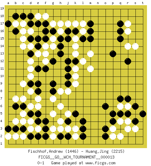 Last move : 0-1 2016 February 21 8:20:26 [Event "FICGS__GO__WCH_TOURNAMENT__000013"] [Site "FICGS"] [Date "2015.07.02"] [Round "1"] [Black "Fischhof,Andrew"] [White "Huang,Jing"] [Result "0-1"] [Rating 1 "1446"] [Rating 2 "2215"] 1.q16 d4 2.q3 d16 3.r5 k3 4.f17 c14 5.j16 r14 6.r12 r17 7.q17 r16 8.q15 s14 9.p13 d10 10.f3 e3 11.f4 d6 12.c3 c4 13.e2 d3 14.d2 c2 15.j2 g2 16.f2 j3 17.h2 g3 18.l2 h3 19.l3 k2 20.l4 h6 21.h5 j5 22.j4 g5 23.k5 h4 24.e5 e6 25.d5 c5 26.c6 c7 27.b3 b2 28.b6 b7 29.o6 r6 30.r7 q6 31.q7 r4 32.q5 s5 33.s6 q4 34.p5 p3 35.s4 s3 36.p4 r3 37.o3 p2 38.o2 q2 39.t5 l17 40.m16 j17 41.k16 k17 42.m17 g17 43.g16 h16 44.h15 h17 45.f15 f18 46.e17 g14 47.h14 g15 48.f16 f14 49.e14 e13 50.d15 c15 51.d17 c17 52.c18 b17 53.b18 e18 54.d18 d14 55.e15 f12 56.b16 c16 57.a17 l16 58.l15 k15 59.j15 k14 60.h13 k13 61.g12 f13 62.d13 d12 63.f11 k11 64.j12 m11 65.k12 l12 66.j11 k10 67.m15 m13 68.e11 d11 69.j10 k9 70.g9 h8 71.g8 g7 72.e9 d8 73.e8 e7 74.j9 j8 75.d9 c9 76.e4 b4 77.a3 a2 0-1 Here are the names of the openings (joseki) played in the four corners : Corner d16 : d16 f17 Hoshi (Hwajeom, Seongjeom, Xingwei`) 4-4 Point. The star or hoshi (4-4) point, emphasizing influence at the potential expense of territory. Ikken Kakari (Hankan Keolch'im, Yi Gua`jiao~, 1-Space Low Approach). Black 2 is the standard approach move to the 4-4. Corner q16 : q16 r14 Hoshi (Hwajeom, Seongjeom, Xingwei`) 4-4 Point. The star or hoshi (4-4) point, emphasizing influence at the potential expense of territory. Ikken Kakari (Hankan Keolch'im, Yi Gua`jiao~, 1-Space Low Approach). White 2 is the standard approach move to the 4-4. Corner d4 : d4 f3 Hoshi (Hwajeom, Seongjeom, Xingwei`) 4-4 Point. The star or hoshi (4-4) point, emphasizing influence at the potential expense of territory. Ikken Kakari (Hankan Keolch'im, Yi Gua`jiao~, 1-Space Low Approach). Black 2 is the standard approach move to the 4-4. Player White won this Go (weiqi, baduk) game. Follow this game move after move (download)Stop on second, extend on third. (Anonymous) I have opinions of my own - strong opinions - but I don't always agree with them. (George Bush)