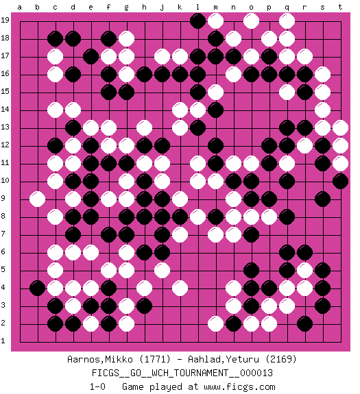 Last move : 1-0 2016 February 27 19:56:59 [Event "FICGS__GO__WCH_TOURNAMENT__000013"] [Site "FICGS"] [Date "2015.07.02"] [Round "1"] [Black "Aarnos,Mikko"] [White "Aahlad,Yeturu"] [Result "1-0"] [Rating 1 "1771"] [Rating 2 "2169"] 1.q16 d4 2.d16 q4 3.d10 f17 4.k16 c14 5.f16 g16 6.f15 c17 7.e17 c16 8.g15 k4 9.q13 q17 10.p17 r17 11.p16 s15 12.m8 r12 13.q12 q11 14.p11 p10 15.o10 o11 16.p12 n9 17.o9 n8 18.p9 m7 19.n10 m10 20.o7 n7 21.m11 c8 22.e8 c6 23.h8 d12 24.o5 n4 25.o4 o8 26.q5 r5 27.q6 n3 28.r6 p3 29.p4 q3 30.r13 l10 31.o3 o2 32.f11 p8 33.q8 l11 34.e5 e4 35.d5 c5 36.f4 f5 37.f3 s13 38.c3 c4 39.d2 e2 40.e3 d3 41.c2 g5 42.h3 f12 43.g11 c10 44.s5 g12 45.h12 h13 46.j12 j10 47.h10 j11 48.e12 e13 49.e11 g17 50.f18 g18 51.d18 k17 52.h16 k14 53.l16 j17 54.l17 h11 55.d13 f13 56.c12 d14 57.j9 g10 58.h9 d9 59.e9 c11 60.d8 d11 61.c9 b9 62.f7 d9 63.e10 e6 64.s12 g9 65.g8 f9 66.h6 g6 67.d7 d6 68.j6 j5 69.k8 k7 70.j7 n11 71.q10 l8 72.g7 k9 73.j8 h4 74.m12 g3 75.f2 g2 76.j16 p18 77.o18 q18 78.p19 o17 79.n17 s14 80.r16 s16 81.s3 r4 82.s4 q19 83.l13 l14 84.m14 k13 85.c18 n18 86.o16 t12 87.s11 t11 88.t10 t13 89.n2 p2 90.r2 m2 91.s9 m15 92.b4 o19 93.m18 o17 94.l15 n16 95.m17 m19 96.l19 q15 97.r15 1-0 Here are the names of the openings (joseki) played in the four corners : Corner d16 : d16 f17 Hoshi (Hwajeom, Seongjeom, Xingwei`) 4-4 Point. The star or hoshi (4-4) point, emphasizing influence at the potential expense of territory. Ikken Kakari (Hankan Keolch'im, Yi Gua`jiao~, 1-Space Low Approach). White 2 is the standard approach move to the 4-4. Corner q4 : q4 m8 Hoshi (Hwajeom, Seongjeom, Xingwei`) 4-4 Point. The star or hoshi (4-4) point, emphasizing influence at the potential expense of territory. Player Black won this Go (weiqi, baduk) game. Follow this game move after move (download)Five groups might live but the six will die. (Anonymous) There's no money in correspondence chess. (John Knudsen)
