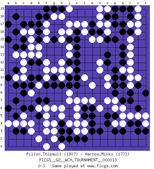 Last move : 0-1 2016 March 8 12:13:17 [Event "FICGS__GO__WCH_TOURNAMENT__000013"] [Site "FICGS"] [Date "2015.07.02"] [Round "1"] [Black "Pillon,Thibault"] [White "Aarnos,Mikko"] [Result "0-1"] [Rating 1 "1807"] [Rating 2 "1771"] 1.q16 d4 2.r4 c16 3.e16 d14 4.c17 b17 5.d17 h16 6.c15 d15 7.b16 d16 8.b18 b15 9.a17 p4 10.n3 q6 11.p3 q4 12.q3 r5 13.s4 r14 14.o4 q11 15.c14 c13 16.b14 b13 17.a15 e13 18.c6 f4 19.c9 e9 20.d12 d13 21.d10 f11 22.h3 c5 23.d6 d8 24.c8 h5 25.k4 b10 26.b9 o17 27.p15 r17 28.n16 o16 29.o15 n15 30.m16 m15 31.q17 l16 32.r16 s18 33.o18 n18 34.p18 s16 35.r18 s17 36.o13 n12 37.m17 l17 38.o12 n11 39.q12 r12 40.p11 k6 41.q10 r11 42.p9 r9 43.r7 q8 44.q7 m9 45.p8 j4 46.j3 n6 47.g15 f16 48.e17 f15 49.l6 k5 50.l5 l7 51.g5 f5 52.h4 b6 53.b7 g6 54.j5 g4 55.j6 k7 56.b5 b4 57.a6 l4 58.m4 g2 59.c3 c4 60.b3 l3 61.m6 m7 62.m5 j7 63.l2 n17 64.f7 e6 65.e7 o7 66.e10 d3 67.g9 o10 68.p10 p7 69.r8 r10 70.q9 s5 71.q13 r13 72.q14 r15 73.q19 h10 74.g10 g11 75.h9 f10 76.f9 o19 77.p17 s19 78.r19 n19 79.p19 f17 80.j10 h11 81.k9 j8 82.j9 a4 83.k12 j11 84.k11 j13 85.o5 p6 86.k13 h6 87.k15 j14 88.k14 k3 89.k2 j4 90.h2 j16 91.f2 g3 92.g1 e2 93.f18 g18 94.e18 t4 95.s3 f3 96.s9 s10 97.t8 f1 98.g19 h18 99.h19 j19 100.f19 h1 101.j2 l10 102.k10 j17 103.m3 k4 104.j12 h12 105.e12 f12 106.j15 h15 107.t3 c10 108.d9 o9 109.s6 t5 110.b11 c11 111.a10 c12 112.e15 e14 113.k16 k17 114.p5 q5 115.e5 f6 0-1 Here are the names of the openings (joseki) played in the four corners : Corner d16 : c16 e16 Komoku (Somok, Xiao~mu`) 3-4 Point. The komoku (3-4) point is the traditional corner enclosure move.. Ikken Takagakari (Hankan Nop'dakeolch'im, Yi Gaogua`jiao~, 1-Space High Approach). The 5-4 approach move has become more popular in modern times, as modern Go emphasizes speed and influence. Corner q4 : r4 p4 Komoku (Somok, Xiao~mu`) 3-4 Point. The komoku (3-4) point is the traditional corner enclosure move.. Ikken Takagakari (Hankan Nop'dakeolch'im, Yi Gaogua`jiao~, 1-Space High Approach). The 5-4 approach move has become more popular in modern times, as modern Go emphasizes speed and influence. Corner q16 : q16 r14 Hoshi (Hwajeom, Seongjeom, Xingwei`) 4-4 Point. The star or hoshi (4-4) point, emphasizing influence at the potential expense of territory. Ikken Kakari (Hankan Keolch'im, Yi Gua`jiao~, 1-Space Low Approach). White 2 is the standard approach move to the 4-4. Corner d4 : d4 c6 Hoshi (Hwajeom, Seongjeom, Xingwei`) 4-4 Point. The star or hoshi (4-4) point, emphasizing influence at the potential expense of territory. Ikken Kakari (Hankan Keolch'im, Yi Gua`jiao~, 1-Space Low Approach). Black 2 is the standard approach move to the 4-4. Player White won this Go (weiqi, baduk) game. Follow this game move after move (download)Keshi is worth as much as an invasion ! (Anonymous) A government big enough to give you everything you want is strong enough to take everything you have. (Thomas Jefferson)