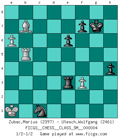 Last move : 1/2-1/2 2007 December 3 11:59:19 [Event "FICGS__CHESS__CLASS_SM__000004"] [Site "FICGS"] [Date "2007.03.06"] [Round "1"] [White "Zubac,Marius"] [Black "Utesch,Wolfgang"] [Result "1/2-1/2"] [WhiteElo "2397"] [BlackElo "2461"] 1.d4 d5 2.c4 c6 3.Nc3 e6 4.Nf3 dxc4 5.Bg5 Be7 6.Bxe7 Nxe7 7.a4 b6 8.e3 Ba6 9.Ne5 Ng6 10.Nxc4 O-O 11.Be2 Nd7 12.O-O Bxc4 13.Bxc4 Nf6 14.Qf3 c5 15.Rfd1 Qe7 16.Ne4 Nxe4 17.Qxe4 Rad8 18.dxc5 Qxc5 19.Bb5 a5 20.Rac1 Rxd1+ 21.Rxd1 h6 22.h3 Ne7 23.Qc4 Qxc4 24.Bxc4 Rc8 25.b3 g5 26.g3 Nc6 27.Rd6 Ne5 28.Bb5 Rc3 29.Rxb6 Rxb3 30.Ra6 Nf3+ 31.Kg2 Ne1+ 32.Kf1 Nf3 33.Rxa5 Rb1+ 34.Ke2 Ng1+ 35.Kd2 Nxh3 36.f3 h5 37.Bc6 Kg7 38.Rb5 Ra1 39.a5 h4 40.gxh4 gxh4 41.Kc2 Nf2 42.Kb2 Re1 43.a6 Nd3+ 44.Ka2 Nc1+ 45.Ka1 Rxe3 46.Bb7 1/2-1/2 QGD Slav defense Kingside Castling by player Black (move 10) Kingside Castling by player White (move 12) This chess game ended in a draw. Follow this game move after move (download)You cannot play at Chess if you are kind-hearted. (French Proverb) Ich spiele ehrlich und spiele, um zu gewinnen. Wenn ich verliere nehme ich meine Medizin. (Robert James Fischer) Con o sin el título, Bobby Fischer fue sin lugar a dudas el mas grande jugador de su época. (Burt Hochberg) La solitude du joueur d'Echecs à l'approche du mat est semblable à celle du condamné. (Francis Szpiner) Wawaweewa ! (Borat: Cultural learnings of America for make benefit glorious nation of Kazakhstan)