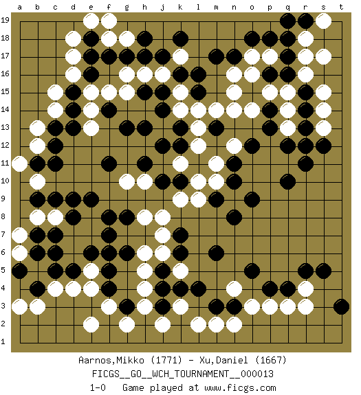 Last move : 1-0 2015 December 23 9:11:46 [Event "FICGS__GO__WCH_TOURNAMENT__000013"] [Site "FICGS"] [Date "2015.07.02"] [Round "1"] [Black "Aarnos,Mikko"] [White "Xu,Daniel"] [Result "1-0"] [Rating 1 "1771"] [Rating 2 "1667"] 1.q16 d16 2.q4 d4 3.f17 c14 4.k16 k3 5.q10 o3 6.o5 r4 7.r5 r3 8.s5 q3 9.g8 r17 10.q17 r16 11.r14 s14 12.r13 s13 13.r15 s15 14.f11 p15 15.n17 r12 16.q12 q15 17.r11 p17 18.c6 f3 19.p16 o16 20.q18 r18 21.p18 o17 22.o18 n16 23.m17 q13 24.s12 q14 25.r12 n14 26.p13 n12 27.n10 k14 28.m13 m14 29.k13 j13 30.j12 l13 31.k12 l12 32.l15 l14 33.g13 j16 34.j17 h16 35.h17 k15 36.c12 d18 37.m6 d7 38.d5 c4 39.c7 e5 40.e6 d6 41.c5 c8 42.d8 e7 43.f6 e8 44.d9 b8 45.f5 e4 46.e9 b5 47.f7 k5 48.d15 c15 49.b6 a6 50.f8 a7 51.g3 g2 52.f4 e2 53.b7 b10 54.r19 s19 55.q19 s17 56.c9 k17 57.l16 g18 58.g17 f18 59.e17 d17 60.b4 b12 61.o15 n15 62.c13 b13 63.j14 m10 64.m9 l10 65.n11 m11 66.k10 k9 67.k7 o14 68.p14 n9 69.o9 k11 70.j10 l9 71.n8 j8 72.h13 j7 73.k6 j6 74.j5 h5 75.j4 h4 76.j3 h3 77.k4 j2 78.l4 h8 79.p4 p3 80.b9 b3 81.a5 a3 82.m3 l2 83.j15 e15 84.e18 e19 85.c11 g15 86.t3 m2 87.f14 f15 88.h15 g16 89.h18 f19 90.n3 n2 91.o12 h10 92.h11 g10 93.g6 h6 94.b11 a11 95.d14 e14 96.d13 e13 97.k18 n4 98.e16 1-0 Here are the names of the openings (joseki) played in the four corners : Corner d16 : d16 f17 Hoshi (Hwajeom, Seongjeom, Xingwei`) 4-4 Point. The star or hoshi (4-4) point, emphasizing influence at the potential expense of territory. Ikken Kakari (Hankan Keolch'im, Yi Gua`jiao~, 1-Space Low Approach). Black 2 is the standard approach move to the 4-4. Corner q4 : q4 o3 Hoshi (Hwajeom, Seongjeom, Xingwei`) 4-4 Point. The star or hoshi (4-4) point, emphasizing influence at the potential expense of territory. Ikken Kakari (Hankan Keolch'im, Yi Gua`jiao~, 1-Space Low Approach). White 2 is the standard approach move to the 4-4. Corner d4 : d4 g8 Hoshi (Hwajeom, Seongjeom, Xingwei`) 4-4 Point. The star or hoshi (4-4) point, emphasizing influence at the potential expense of territory. Corner q16 : q16 r17 Hoshi (Hwajeom, Seongjeom, Xingwei`) 4-4 Point. The star or hoshi (4-4) point, emphasizing influence at the potential expense of territory. Player Black won this Go (weiqi, baduk) game. Follow this game move after move (download)Go is to western chess what philosophy is to double entry accounting. (from Shibumi, by Trevanian) This is where the fun begins. (Anakin Skywalker in Star Wars ep.3)