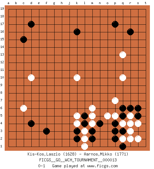 Last move : 0-1 2015 August 18 20:37:6 [Event "FICGS__GO__WCH_TOURNAMENT__000013"] [Site "FICGS"] [Date "2015.07.02"] [Round "1"] [Black "Kis-Kos,Laszlo"] [White "Aarnos,Mikko"] [Result "0-1"] [Rating 1 "1628"] [Rating 2 "1771"] 1.r16 k4 2.d17 q4 3.d4 d10 4.c15 q10 5.p17 c6 6.f3 k10 7.k16 q13 8.n4 m6 9.l5 m5 10.l4 m4 11.m3 l3 12.k3 l2 13.k2 k5 14.m2 l1 15.r6 r5 16.q6 o5 17.p4 p5 18.q5 r4 19.p3 q2 20.p2 s2 21.q3 r3 22.q1 r2 23.s5 s4 24.s6 p7 0-1 Here are the names of the openings (joseki) played in the four corners : Corner d4 : d4 c6 Hoshi (Hwajeom, Seongjeom, Xingwei`) 4-4 Point. The star or hoshi (4-4) point, emphasizing influence at the potential expense of territory. Ikken Kakari (Hankan Keolch'im, Yi Gua`jiao~, 1-Space Low Approach). White 2 is the standard approach move to the 4-4. Corner q4 : q4 n4 Hoshi (Hwajeom, Seongjeom, Xingwei`) 4-4 Point. The star or hoshi (4-4) point, emphasizing influence at the potential expense of territory. Niken Takagakari (Dukan Nop'dakeolch'im, E`r Gaojia, 2-Space High Approach). Black 2 is a light approach move. Rarely played in even games, Black 2 is typically employed in handicap games. White continues with 6-4 or 3-10. In Korean Sunjang Baduk White has a stone on 8-4. Player White won this Go (weiqi, baduk) game. Follow this game move after move (download)Learn to play under the stones. (Anonymous) Locking firmely the window serves nothing, only small thiefs pass through there, the big thiefs enter through the front door. (Luc-Olivier Leclerc)