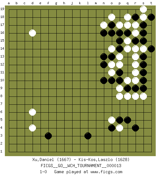 Last move : 1-0 2015 July 21 19:32:40 [Event "FICGS__GO__WCH_TOURNAMENT__000013"] [Site "FICGS"] [Date "2015.07.02"] [Round "1"] [Black "Xu,Daniel"] [White "Kis-Kos,Laszlo"] [Result "1-0"] [Rating 1 "1667"] [Rating 2 "1628"] 1.q16 d4 2.r4 d16 3.f3 d6 4.l3 r10 5.q9 q10 6.r9 p9 7.p10 p8 8.p11 r8 9.s9 s8 10.s10 p4 11.p5 o5 12.q5 q8 13.o4 r11 14.s11 r12 15.s12 r13 16.s13 r14 17.s15 s14 18.t14 p13 19.n10 r16 20.s16 r17 21.r15 q15 22.p15 q14 23.s17 q17 24.p16 p17 25.o17 o18 26.n16 n17 27.o16 s18 28.r18 q18 29.t18 s19 30.o13 o14 31.p14 o12 32.n13 p12 33.n12 o11 34.o10 1-0 Here are the names of the openings (joseki) played in the four corners : Corner d4 : d4 f3 Hoshi (Hwajeom, Seongjeom, Xingwei`) 4-4 Point. The star or hoshi (4-4) point, emphasizing influence at the potential expense of territory. Ikken Kakari (Hankan Keolch'im, Yi Gua`jiao~, 1-Space Low Approach). Black 2 is the standard approach move to the 4-4. Player Black won this Go (weiqi, baduk) game. Follow this game move after move (download)In an unreasonable situation, an unreasonable move is reasonable. (Tamino) Indecision is the key to flexibility. (Unknown)