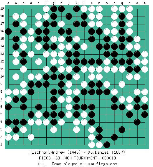 Last move : 0-1 2016 January 13 4:44:1 [Event "FICGS__GO__WCH_TOURNAMENT__000013"] [Site "FICGS"] [Date "2015.07.02"] [Round "1"] [Black "Fischhof,Andrew"] [White "Xu,Daniel"] [Result "0-1"] [Rating 1 "1446"] [Rating 2 "1667"] 1.q16 d4 2.q3 d16 3.r5 k3 4.f17 h17 5.k17 c14 6.j16 e17 7.f16 f18 8.g18 e18 9.g17 r14 10.r11 r17 11.q17 r16 12.q15 s14 13.p13 r18 14.c6 c8 15.e6 f4 16.g6 h4 17.d9 c9 18.d8 d10 19.f9 e10 20.f10 e12 21.b4 c3 22.b3 j6 23.m4 m2 24.n2 m3 25.n3 l4 26.m5 r6 27.q6 s5 28.s6 r7 29.s7 q7 30.p6 s8 31.s4 q9 32.p7 q11 33.q12 p11 34.p12 r10 35.s11 o11 36.n12 n11 37.m12 p18 38.q18 q19 39.o18 p17 40.o17 p16 41.o19 p19 42.o15 g12 43.j12 h13 44.j13 h14 45.h16 n1 46.o1 m1 47.p2 p15 48.q14 o16 49.n16 n17 50.p14 r19 51.m16 m17 52.l17 m18 53.l18 n19 54.j10 t7 55.t5 s10 56.r13 p8 57.o8 o9 58.n8 b2 59.b7 b8 60.c7 j14 61.k14 j19 62.h19 l19 63.j18 j8 64.k7 j7 65.k6 k8 66.l8 l9 67.m8 k10 68.k11 l11 69.l12 m11 70.b17 c18 71.c16 c15 72.b15 c17 73.a16 b18 74.b14 b13 75.c13 d13 76.c12 b12 77.c10 b10 78.e9 c11 79.f14 h11 80.h10 j11 81.k12 f13 82.g14 g13 83.g11 h12 84.c4 d2 85.d5 e5 86.f5 e4 87.h5 j5 88.g4 g3 89.g5 a2 90.g8 o12 91.o13 k15 92.j15 n15 93.o14 l14 94.k13 s12 95.s13 t11 96.r12 t13 97.m15 t12 98.r15 s15 99.n14 e14 100.e15 d15 101.e16 l5 102.l6 f11 103.g10 a7 104.a6 a8 105.k19 n18 106.h8 h7 107.g7 a3 108.a4 j9 109.h9 g15 110.f15 h15 111.n9 n10 112.m9 m10 113.k5 k4 114.m6 f19 115.g19 t8 116.t6 m19 117.pass pass 0-1 Here are the names of the openings (joseki) played in the four corners : Corner d16 : d16 f17 Hoshi (Hwajeom, Seongjeom, Xingwei`) 4-4 Point. The star or hoshi (4-4) point, emphasizing influence at the potential expense of territory. Ikken Kakari (Hankan Keolch'im, Yi Gua`jiao~, 1-Space Low Approach). Black 2 is the standard approach move to the 4-4. Corner q16 : q16 r14 Hoshi (Hwajeom, Seongjeom, Xingwei`) 4-4 Point. The star or hoshi (4-4) point, emphasizing influence at the potential expense of territory. Ikken Kakari (Hankan Keolch'im, Yi Gua`jiao~, 1-Space Low Approach). White 2 is the standard approach move to the 4-4. Corner d4 : d4 c6 Hoshi (Hwajeom, Seongjeom, Xingwei`) 4-4 Point. The star or hoshi (4-4) point, emphasizing influence at the potential expense of territory. Ikken Kakari (Hankan Keolch'im, Yi Gua`jiao~, 1-Space Low Approach). Black 2 is the standard approach move to the 4-4. Player White won this Go (weiqi, baduk) game. Follow this game move after move (download)You can hide nothing on the goban. (Pierre Audouard) Memory is a crazy woman that hoards colored rags and throws away food. (Austin O'Malley)