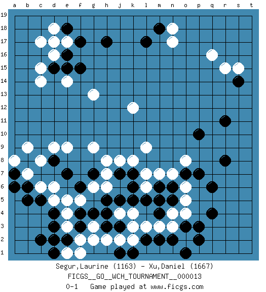 Last move : 0-1 2015 November 7 21:11:47 [Event "FICGS__GO__WCH_TOURNAMENT__000013"] [Site "FICGS"] [Date "2015.07.02"] [Round "1"] [Black "Segur,Laurine"] [White "Xu,Daniel"] [Result "0-1"] [Rating 1 "1163"] [Rating 2 "1667"] 1.d4 q16 2.q4 d16 3.f17 c14 4.d17 c17 5.e16 d18 6.e18 e17 7.f15 d17 8.d15 c15 9.h17 n17 10.l17 r15 11.r8 k3 12.h3 n3 13.o3 o2 14.p2 o4 15.p3 n4 16.o1 c6 17.c5 d6 18.r11 e4 19.d3 e3 20.b6 b7 21.b5 c8 22.h5 d5 23.e2 f2 24.c2 g3 25.g4 h2 26.g7 g9 27.e7 e9 28.d8 d9 29.s14 s15 30.k6 e14 31.e15 g13 32.m6 o6 33.q6 l7 34.p10 l6 35.j7 h8 36.l5 m7 37.m4 k4 38.k5 j8 39.n6 n7 40.o7 m5 41.n5 o5 42.m5 m3 43.k7 k8 44.j3 j4 45.h4 j2 46.l2 l3 47.m2 k2 48.f4 e5 49.f3 g2 50.n2 h7 51.j5 g6 52.k1 e1 53.d2 o8 54.p7 l9 55.m18 n18 56.d1 f1 57.f6 f5 58.b8 b9 59.a7 a8 60.a6 k12 61.j1 h6 0-1 Here are the names of the openings (joseki) played in the four corners : Corner d16 : d16 f17 Hoshi (Hwajeom, Seongjeom, Xingwei`) 4-4 Point. The star or hoshi (4-4) point, emphasizing influence at the potential expense of territory. Ikken Kakari (Hankan Keolch'im, Yi Gua`jiao~, 1-Space Low Approach). Black 2 is the standard approach move to the 4-4. Player White won this Go (weiqi, baduk) game. Follow this game move after move (download)Grab the border points between two moyos. (Anonymous) Life is pleasant. Death is peaceful. It's the transition that's troublesome. (Isaac Asimov)