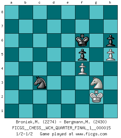 Last move : 1/2-1/2 2015 December 4 5:37:56 [Event "FICGS__CHESS__WCH_QUARTER_FINAL_1__000015"] [Site "FICGS"] [Date "2015.07.02"] [Round "4"] [White "Broniek,Mariusz Maciej"] [Black "Bergmann,Michael"] [Result "1/2-1/2"] [WhiteElo "2274"] [BlackElo "2430"] 1.e4 c5 2.Nf3 Nc6 3.d4 cxd4 4.Nxd4 Nf6 5.Nc3 e5 6.Ndb5 d6 7.Nd5 Nxd5 8.exd5 Nb8 9.c4 Be7 10.Bd3 O-O 11.O-O a6 12.Nc3 f5 13.f3 Nd7 14.Be3 Bg5 15.Bf2 Qf6 16.Bc2 Qh6 17.h3 Be3 18.Qe2 Bxf2+ 19.Rxf2 b6 20.Ba4 Rb8 21.Bc6 Rf6 22.f4 e4 23.Raf1 Nc5 24.Qe3 Rf7 25.Rd2 Nd3 26.Ne2 Qf6 27.Nd4 Rc7 28.Kh2 h6 29.b3 Nc5 30.a3 Nd3 31.g3 Kh7 32.Re2 Re7 33.Rg1 g5 34.Rf1 a5 35.Rg2 Qg6 36.Kg1 Qf6 37.Kh1 Kh8 38.Kh2 Qg6 39.Ne2 Ba6 40.Qd4+ Kh7 41.h4 Qg7 42.Qe3 gxh4 43.gxh4 Qf6 44.Qg3 e3 45.h5 Nf2 46.Qg6+ Qxg6 47.Rxg6 a4 48.Bxa4 b5 49.cxb5 Bxb5 50.Bxb5 Rxb5 51.Rxd6 Rxb3 52.Rg6 Rb2 53.d6 Rd7 54.Ng1 Rxd6 55.Rxd6 Ne4 56.Kh3 Nxd6 57.Re1 Rb3 58.Kg2 Rxa3 59.Ne2 Rd3 60.Ng3 Kg7 61.Nf1 Kf6 62.Rxe3 Rxe3 63.Nxe3 Nb5 64.Nf1 Nc3 65.Ng3 1/2-1/2 Sicilian : Pelikan (Lasker/Sveshnikov) variation Kingside Castling by player Black (move 10) Kingside Castling by player White (move 11) 10 pieces endgame at move 62 : White KRNPP , Black KRNPP WHITE : King + 1 Rook 1 Knight 2 Pawns BLACK : King + 1 Rook 1 Knight 2 Pawns 9 pieces endgame at move 62 : White KNPP , Black KRNPP WHITE : King + 1 Knight 2 Pawns BLACK : King + 1 Rook 1 Knight 2 Pawns 8 pieces endgame at move 63 : White KNPP , Black KNPP WHITE : King + 1 Knight 2 Pawns BLACK : King + 1 Knight 2 Pawns This chess game ended in a draw. Follow this game move after move (download)First-class players lose to second class players because second-class players sometimes play a first-class game. (Tarrasch) Ich bin Weltmeister und muß mit niemandem irgend etwas diskutieren. (Viswanathan Anand) No existe un remordimiento como el remordimiento del Ajedrez. (H. G. Wells) Nous vivons dans un monde échiquéen : chaque jour qui passe est un défi à relever. (Philosophe Sasha) Good decisions come from experience, and experience comes from bad decisions. (Anonymous)