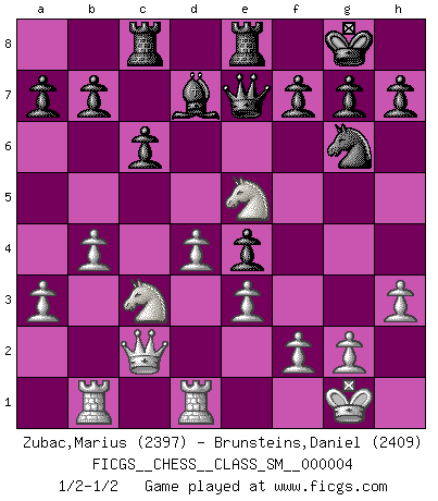 Last move : 1/2-1/2 2007 July 20 19:23:20 [Event "FICGS__CHESS__CLASS_SM__000004"] [Site "FICGS"] [Date "2007.03.06"] [Round "1"] [White "Zubac,Marius"] [Black "Brunsteins,Daniel"] [Result "1/2-1/2"] [WhiteElo "2397"] [BlackElo "2409"] 1.d4 d5 2.c4 e6 3.Nc3 Nf6 4.cxd5 exd5 5.Bg5 Be7 6.e3 c6 7.Bd3 O-O 8.Qc2 Nbd7 9.Nf3 Re8 10.O-O Nf8 11.h3 Be6 12.Bf4 Rc8 13.a3 Ng6 14.Bg3 Bd6 15.Bxd6 Qxd6 16.b4 Bd7 17.Rab1 Qe7 18.Rfd1 Ne4 19.Bxe4 dxe4 20.Ne5 1/2-1/2 QGD : Exchange, positional line Kingside Castling by player Black (move 7) Kingside Castling by player White (move 10) This chess game ended in a draw. Follow this game move after move (download)Chess books should be used as we use glasses: to assist the sight, although some players make use of them as if they thought they conferred sight. (Jose Raul Capablanca) Schach ist wie eine schöne Frau, zu der wir ständig zurückkehren, gleichviel, wie oft sie uns zurückweist. (Anonymous) Un juego de Ajedrez es un dialogo, una conversación entre un jugador y su oponente. Cada movimiento del oponente puede contener amenazas o tropiezos, pero un jugador no se puede defender de las amenazas o tomar ventaja de los tropiezos si es que no se pregunta a sí mismo: ¿Que es lo que mi oponente va a hacer después de cada movida?. (Bruce A. Moon) 'L'échange des dames est un coup dur pour les deux adversaires...' Un journaliste lors d'une partie du match Spassky-Fischer CHESS, n. f. [echecs, Fr.] A nice and abstruse game, in which two sets of puppets are moved in opposition to each other. (Dr Samuel Johnson, A Dictionary Of The English Language, 1755)