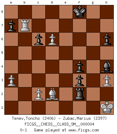 Last move : 0-1 2007 June 17 7:6:59 [Event "FICGS__CHESS__CLASS_SM__000004"] [Site "FICGS"] [Date "2007.03.06"] [Round "1"] [White "Tenev,Toncho"] [Black "Zubac,Marius"] [Result "0-1"] [WhiteElo "2406"] [BlackElo "2397"] 1.e4 c5 2.Nf3 Nc6 3.Bb5 g6 4.Bxc6 dxc6 5.d3 Bg7 6.h3 Nf6 7.Nc3 Nd7 8.Be3 e5 9.O-O Qe7 10.Qd2 h6 11.a3 Nf8 12.b4 Ne6 13.bxc5 f5 14.exf5 gxf5 15.Qe1 Bf6 16.Rb1 Rg8 17.Rb4 f4 18.Bd2 Nxc5 19.Kh2 Bf5 20.d4 e4 21.dxc5 exf3 22.Rxb7 Rxg2 23.Kh1 Qxe1 24.Rxe1+ Kf8 25.Ne4 Bxe4 26.Rxe4 Rd8 27.Re6 Bh4 28.Rd6 Rxd6 29.cxd6 Rxf2 0-1 Sicilian : Nimzovich-Rossolimo attack (with ...g6, without ...d6) Kingside Castling by player White (move 9) Player Black won this chess game. Follow this game move after move (download)The mistakes are there, waiting to be made. (Savielly Tartakower) Nicht daß Diemer aus Opportunismus Mitglied der NSDAP geworden wäre. Er war ein Fanatiker, in allem, was er tat. (Hans Ree) En la vida, como en el Ajedrez, los Peones propios obstruyen nuestro camino. La gran fortuna de un hombre, su comodidad, placer, hijos, libros, que deberían ayudarle a ganar, con mucha frecuencia lo ponen en Jaque Mate. (Charles Buxton) La tactique, c'est ce que vous faites quand il y a quelque chose à faire; la stratégie, c'est ce que vous faites quand il n'y a rien à faire. (Savielli Tartacower) Chess is as much a mystery as women. (Purdy)
