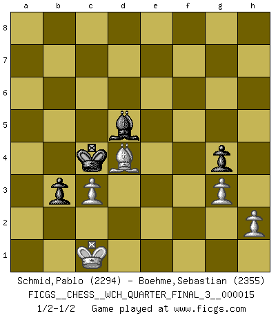 Last move : 1/2-1/2 2016 January 2 2:16:46 [Event "FICGS__CHESS__WCH_QUARTER_FINAL_3__000015"] [Site "FICGS"] [Date "2015.07.02"] [Round "4"] [White "Schmid,Pablo"] [Black "Boehme,Sebastian"] [Result "1/2-1/2"] [WhiteElo "2294"] [BlackElo "2355"] 1.e4 e5 2.Nf3 Nc6 3.Bb5 a6 4.Ba4 Nf6 5.O-O Nxe4 6.d4 b5 7.Bb3 d5 8.dxe5 Be6 9.Nbd2 Nc5 10.c3 Be7 11.Bc2 d4 12.cxd4 Nxd4 13.Nxd4 Qxd4 14.Nf3 Qxd1 15.Rxd1 Rd8 16.Rxd8+ Kxd8 17.Nd4 Bd5 18.Nf5 g6 19.Nxe7 Kxe7 20.Be3 Nd7 21.Rd1 c6 22.Bd2 Rc8 23.f4 f6 24.exf6+ Nxf6 25.Re1+ Kf7 26.f5 g5 27.a3 c5 28.g3 h6 29.Ba5 Rc6 30.Re2 Bf3 31.Re5 g4 32.Bd2 Nd5 33.Kf2 c4 34.Re6 Rxe6 35.fxe6+ Kxe6 36.Bxh6 Bh1 37.Bg7 a5 38.Ke2 b4 39.Kd2 Ne7 40.Bf8 Nd5 41.Ba4 Be4 42.axb4 axb4 43.Bg7 Nb6 44.Bb5 Kd5 45.Be8 c3+ 46.bxc3 Nc4+ 47.Kd1 b3 48.Bf7+ Kc5 49.Bd4+ Kb5 50.Bxc4+ Kxc4 51.Kc1 Bd5 1/2-1/2 Ruy Lopez : Open, 7.Bb3 Kingside Castling by player White (move 5) 10 pieces endgame at move 50 : White KBBPPP , Black KBPP WHITE : King + 2 Bishops 3 Pawns BLACK : King + 1 Bishop 2 Pawns 9 pieces endgame at move 50 : White KBPPP , Black KBPP WHITE : King + 1 Bishop 3 Pawns BLACK : King + 1 Bishop 2 Pawns This chess game ended in a draw. Follow this game move after move (download)If I win a tournament, I win it by myself. I do the playing. Nobody helps me. (Bobby Fischer) Ich brauche nur einen Blick auf das Schachbrett zu werfen, und weiß schon, was in der Stellung steckt, was geschehen kann und was geschehen wird. Alle übrigen suchen und prüfen, ich aber weiß es! (José Raúl Capablanca) Morphy probablemente fue el genio más grande de todos. (Bobby Fischer) Le jeu d'échecs est comme rejeté hors du temps. (Antoine de Saint-Exupéry) For to win one hundred victories in one hundred battles is not the acme of skill. To subdue the enemy without fighting is the acme of skill. (Sun Tzu)