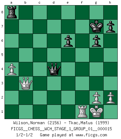 Last move : 1/2-1/2 2015 August 10 10:16:9 [Event "FICGS__CHESS__WCH_STAGE_1_GROUP_01__000015"] [Site "FICGS"] [Date "2015.07.02"] [Round "1"] [White "Wilson,Norman"] [Black "Tkac,Matus"] [Result "1/2-1/2"] [WhiteElo "2156"] [BlackElo "1999"] 1.d4 Nf6 2.c4 g6 3.Nc3 d5 4.cxd5 Nxd5 5.e4 Nxc3 6.bxc3 Bg7 7.Bb5+ c6 8.Ba4 O-O 9.Ne2 b5 10.Bb3 a5 11.O-O Nd7 12.e5 e6 13.Ng3 c5 14.Ne4 Bb7 15.Nd6 Bc6 16.a4 b4 17.cxb4 axb4 18.f4 cxd4 19.Qxd4 Bd5 20.Qxb4 Nxe5 21.fxe5 Bxe5 22.Bf4 Bxf4 23.Rxf4 Bxb3 24.Nxf7 Rxf7 25.Rxf7 Kxf7 26.Rf1+ Kg7 27.Qxb3 Qd4+ 1/2-1/2 King's Indian defense, 3.Nc3 Kingside Castling by player Black (move 8) Kingside Castling by player White (move 11) This chess game ended in a draw. Follow this game move after move (download)The passed Pawn is a criminal, who should be kept under lock and key. Mild measures, such as police surveillance, are not sufficient. (Aaron Nimzovich) Wer mein Gambit spielt, muß bereit sein, alle Brücken hinter sich abzubrechen. Es verändert den ganzen Menschen. Es wirkt wie ein Zauberstab und fördert verkümmerte, gute Charakter- eigenschaften wieder zu Tage. (Emil Joseph Diemer) Cualquier cambio de material en una posición debe venir por medio de un mate, una captura o promoción de Peón. (Purdy) En blitz, le Cavalier l'emporte sur le Fou. (Vlastimil Hort) Somehow our devils are never quite what we expect when we meet them face to face. (Nelson DeMille)
