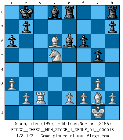 Last move : 1/2-1/2 2015 August 24 9:9:9 [Event "FICGS__CHESS__WCH_STAGE_1_GROUP_01__000015"] [Site "FICGS"] [Date "2015.07.02"] [Round "1"] [White "Dyson,John"] [Black "Wilson,Norman"] [Result "1/2-1/2"] [WhiteElo "1990"] [BlackElo "2156"] 1.d4 Nf6 2.c4 e6 3.g3 d5 4.Nf3 dxc4 5.Bg2 Nc6 6.Qa4 Nd7 7.Qxc4 Nb6 8.Qd3 e5 9.Nxe5 Nb4 10.Qc3 Qxd4 11.O-O Qxc3 12.Nxc3 f6 13.Nf3 Bd7 14.Rd1 O-O-O 15.Bf4 g5 16.Be3 Be7 17.a3 Nc2 18.Bxb6 Nxa1 19.Nd5 Nb3 20.Bxc7 Rde8 21.Nd2 Nxd2 22.Rxd2 Be6 23.Ba5 Bd8 24.Rc2+ Kb8 25.Bb4 a6 26.Bd6+ Ka7 27.Bc5+ Kb8 28.Bd6+ 1/2-1/2 Catalan Opening Kingside Castling by player White (move 11) Queenside Castling by player Black (move 14) This chess game ended in a draw. Follow this game move after move (download)No one ever won a game by resigning. (Unknown) Ich bin Weltmeister und muß mit niemandem irgend etwas diskutieren. (Viswanathan Anand) El Ajedrez es un terrible juego. Si no controlas el centro, tu oponente tiene una posición mas holgada. Si tienes control del centro, ¡entonces realmente tu tienes algo de que preocuparte!. (Siegbert Tarrasch) Ce n'est pas pour s'amuser qu'il joue aux échecs : il célèbre un culte. (Vladimir Nabokov) You cannot beat a roulette table unless you steal money from it. (Albert Einstein)
