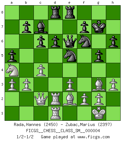 Last move : 1/2-1/2 2007 December 15 17:47:7 [Event "FICGS__CHESS__CLASS_SM__000004"] [Site "FICGS"] [Date "2007.03.06"] [Round "1"] [White "Rada,Hannes"] [Black "Zubac,Marius"] [Result "1/2-1/2"] [WhiteElo "2450"] [BlackElo "2397"] 1.c4 e5 2.Nc3 Bb4 3.Nd5 Bc5 4.Nf3 c6 5.Nc3 Qe7 6.d4 exd4 7.Nxd4 Nf6 8.Bg5 h6 9.Bh4 d6 10.a3 Bg4 11.h3 Be6 12.e3 Nbd7 13.Be2 O-O 14.O-O Rfe8 15.Qc2 a5 16.Rfd1 Bb6 17.Rd2 Rac8 18.Rad1 Bc7 19.Nf5 Bxf5 20.Qxf5 Qe6 21.Qc2 Rcd8 22.Rd4 g5 23.Bg3 Ne5 24.b3 Bb6 25.R4d2 Bc5 26.Qb2 Ba7 27.Qb1 Bb6 28.Na4 Bc7 29.Qc2 Kg7 30.Rd4 Kg8 31.R4d2 Kg7 1/2-1/2 English, Kramnik-Shirov counterattack Kingside Castling by player Black (move 13) Kingside Castling by player White (move 14) This chess game ended in a draw. Follow this game move after move (download)You sit at the board and suddenly your heart leaps. Your hand trembles to pick up the piece and move it. But what Chess teaches you is that you must sit there calmly and think about whether it's really a good idea and whether there are other better ideas. (Stanley Kubrick) Die Partien sind immer verschieden, die Interviews immer die gleichen. (Garry Kasparov) El Ajedrez no es una pizca de inferior al violín, y tenemos un gran número de violinistas profesionales. (Mikhail Botvinnik) Les Echecs, c'est l'art de la guerre sans les charniers, c'est la résurrection des morts tombés au champ d'honneur, l'espoir perpétuel, la suprématie de l'intelligence sur la force, la culture de l'esprit. (F. Szpiner) Perception is reality. (Immanuel Kant)