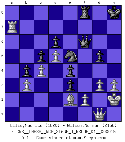 Last move : 0-1 2015 October 4 19:58:24 [Event "FICGS__CHESS__WCH_STAGE_1_GROUP_01__000015"] [Site "FICGS"] [Date "2015.07.02"] [Round "1"] [White "Ellis,Maurice"] [Black "Wilson,Norman"] [Result "0-1"] [WhiteElo "1820"] [BlackElo "2156"] 1.d4 Nf6 2.c4 e6 3.Nf3 Bb4+ 4.Bd2 c5 5.Bxb4 cxb4 6.Nbd2 O-O 7.e3 Nc6 8.Be2 d6 9.O-O e5 10.d5 Ne7 11.Bd3 Bg4 12.h3 Bxf3 13.Qxf3 Nd7 14.Qd1 f5 15.Be2 a5 16.a3 Nc5 17.axb4 axb4 18.Qc2 Ng6 19.Nb3 Rxa1 20.Rxa1 b6 21.Ra7 Qg5 22.Nxc5 bxc5 23.b3 Nh4 24.Bf1 e4 25.Kh1 Ng6 26.g3 Ne5 27.Be2 Qh6 28.Kh2 g5 29.Qc1 Qf6 30.Kg2 Qg6 31.Kh2 Rf7 32.Ra8+ Kg7 33.Ra6 Qf6 34.Bh5 Rf8 35.Ra7+ Kg8 36.Be2 h5 37.Qg1 Kh8 38.Bxh5 f4 39.Be2 fxe3 0-1 Bogo-Indian defense Kingside Castling by player Black (move 6) Kingside Castling by player White (move 9) Player Black won this chess game. Follow this game move after move (download)Only sissies Castle. (Rob Sillars) Du weisst es gibt ein Problem mit Computern und Fernschach, wenn jeder eine Rating von 2450 hat. (John Christen Knudsen) Debemos de asegurarnos de que el Ajedrez no se convierta en un lenguaje muerto, muy interesante, pero tan solo para un grupo muy pequeño. (Sytze Faber) Des combinaisons [dans le jeu d'échecs] pareilles à des mélodies. Je crois entendre pour ainsi dire la musique des coups... (Vladimir Nabokov) The various flowers seem good to different people. (Chinese proverb)