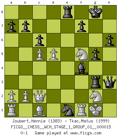 Last move : 0-1 2015 August 18 9:3:20 [Event "FICGS__CHESS__WCH_STAGE_1_GROUP_01__000015"] [Site "FICGS"] [Date "2015.07.02"] [Round "1"] [White "Joubert,Hennie"] [Black "Tkac,Matus"] [Result "0-1"] [WhiteElo "1383"] [BlackElo "1999"] 1.e4 e5 2.Nf3 Nf6 3.Nxe5 d6 4.Nf3 Nxe4 5.d4 d5 6.Bd3 Bd6 7.O-O O-O 8.c4 c6 9.Qc2 h6 10.Bxe4 dxe4 11.Qxe4 Re8 12.Qd3 Na6 13.Nc3 Bg4 14.Ne1 Qh4 15.h3 Nb4 16.Qd2 Bxh3 17.gxh3 Re6 18.f4 Rae8 19.Ng2 Qxh3 20.c5 Bc7 21.Qf2 Rg6 22.Nd1 Rg3 23.Nde3 Nd3 24.Qc2 g5 25.d5 Bxf4 26.Nf5 Ne1 0-1 Petrov : Classical attack, Marshall variation Kingside Castling by player White (move 7) Kingside Castling by player Black (move 7) Player Black won this chess game. Follow this game move after move (download)You cannot play at Chess if you are kind-hearted. (French Proverb) Die Leute spielen gegen mich seit 15 Jahren unter Ihren Möglichkeiten. (Robert James Fischer) Creo que una cierta cantidad de temperamento es esperada de los genios del Ajedrez. (Ron Gross) Vous m'avez demandé de vous exposer quel est le fondement de la prière. Je ne fais que préparer les pièces du jeu sur la table... Nous sera-t-il permis d'en adopter les règles et si nous les appliquons scrupuleusement nous ne tarderons pas à faire mat le Roi divin ! Il ne pourra échapper à nos mains. (Sainte Thérèse d'Avila, Chemin de perfection) Begin at the beginning and go on till you come to the end; then stop. (Lewis Carrol, Alice in Wonderland)