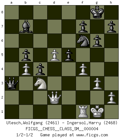 Last move : 1/2-1/2 2007 June 3 6:52:4 [Event "FICGS__CHESS__CLASS_SM__000004"] [Site "FICGS"] [Date "2007.03.06"] [Round "1"] [White "Utesch,Wolfgang"] [Black "Ingersol,Harry"] [Result "1/2-1/2"] [WhiteElo "2461"] [BlackElo "2468"] 1.d4 Nf6 2.c4 e6 3.g3 c5 4.d5 exd5 5.cxd5 b5 6.Bg2 d6 7.b4 Nbd7 8.a3 g6 9.Nc3 Bg7 10.Bf4 Qb6 11.Nf3 O-O 12.O-O Re8 13.Rb1 a6 14.a4 Nh5 15.Bd2 c4 16.Ra1 Bb7 17.axb5 axb5 18.Rxa8 Bxa8 19.e4 Bxc3 20.Bxc3 Rxe4 21.Nd4 Nhf6 22.Bxe4 Nxe4 23.Ne2 Ne5 24.Bd4 Qb7 25.f3 Nf6 26.Bxe5 dxe5 27.Nc3 Qa6 28.Qd2 Bb7 29.f4 Qa7+ 30.Qf2 Qa3 31.Qd2 1/2-1/2 Catalan Opening Kingside Castling by player Black (move 11) Kingside Castling by player White (move 12) This chess game ended in a draw. Follow this game move after move (download)I know people who have all the will in the world, but still can't play good Chess. (Bobby Fischer) Ich bin der einzige Schachspieler, der sich während der Vorbereitungen zum Turnier verletzt hat. (Woody Allen) Yo creo que el Ajedrez posee una magia que es también una ayuda en la edad avanzada. Una rodilla reumática es olvidada durante una partida de Ajedrez y otros eventos pueden parecer algo sin importancia comparada a una catástrofe en el tablero de Ajedrez. (Vlastimil Hort) Toutes choses étant égales, c'est la conviction qui gagne. Alliée à une volonté de vaincre, elle sert de détonateur, suscite des idées, disperse les doutes et aide à penser clairement. (Robert Fischer) You must do what you feel is right... of course. (Obi-Wan Kenobi in Star Wars ep.4)