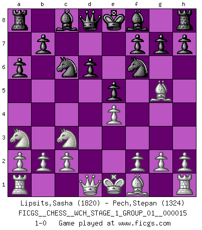 Last move : 1-0 2015 August 18 21:16:43 [Event "FICGS__CHESS__WCH_STAGE_1_GROUP_01__000015"] [Site "FICGS"] [Date "2015.07.02"] [Round "1"] [White "Lipsits,Sasha"] [Black "Pech,Stepan"] [Result "1-0"] [WhiteElo "1820"] [BlackElo "1324"] 1.e4 c5 2.Nf3 Nc6 3.d4 cxd4 4.Nxd4 Nf6 5.Nc3 e5 6.Ndb5 d6 7.Bg5 a6 8.Na3 1-0 This chess game has been lost on time (started : 2015.07.02 14:13:21) Sicilian : Pelikan (Lasker/Sveshnikov) variation Player White won this chess game. Follow this game move after move (download)I play correspondence chess because it is both art and science while chess is art only. (A player at FICGS) Die Jungen erwarten, dass Opa einfach umfällt. Dann aber kann Opa fünf Stunden lang Schach spielen und die jungen Gegner an die Wand drücken. (Viktor Kortschnoi) Morphy probablemente fue el genio más grande de todos. (Bobby Fischer) Il vaut toujours mieux jouer un plan faux de façon logique que de n'avoir pas de plan du tout. (Victor Kortchnoï) Imagination is more important than knowledge. Knowledge is limited. Imagination encircles the world. (Albert Einstein)