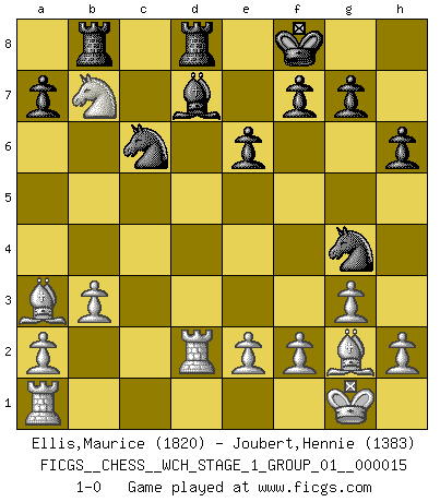 Last move : 1-0 2015 August 18 9:3:50 [Event "FICGS__CHESS__WCH_STAGE_1_GROUP_01__000015"] [Site "FICGS"] [Date "2015.07.02"] [Round "1"] [White "Ellis,Maurice"] [Black "Joubert,Hennie"] [Result "1-0"] [WhiteElo "1820"] [BlackElo "1383"] 1.d4 Nf6 2.c4 e6 3.g3 d5 4.Bg2 dxc4 5.Nf3 c5 6.O-O Nc6 7.dxc5 Qxd1 8.Rxd1 Bxc5 9.Nbd2 Bd7 10.Nxc4 Ng4 11.Nd6+ Bxd6 12.Rxd6 Ke7 13.Rd2 Rhd8 14.b3 Rac8 15.Ba3+ Ke8 16.Ng5 h6 17.Ne4 Rb8 18.Nd6+ Kf8 19.Nxb7 1-0 Catalan : Open, 5.Nf3 Kingside Castling by player White (move 6) Player White won this chess game. Follow this game move after move (download)Fischer is the strongest player in the world. In fact, the strongest player who ever lived. (Larry Evans) Wie bekannt hörte Morphy 1859 auf, Schach zu spielen. Seine Enttäuschung galt nicht so sehr dem Schach, wie den Schachspielern. (Robert James Fischer) La pasion por jugar al Ajedrez es una de las mas inexplicables en el mundo. (H.G. Wells) Les échecs sont plus proches de l'art de l'assassinat que de l'art de la guerre. (Arturo Perez-Reverte) The meaning of life is that it is to be lived, and it is not to be traded and conceptualized and squeezed into a pattern of systems. (Bruce Lee)