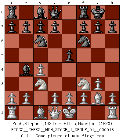 Last move : 0-1 2015 August 15 20:44:59 [Event "FICGS__CHESS__WCH_STAGE_1_GROUP_01__000015"] [Site "FICGS"] [Date "2015.07.02"] [Round "1"] [White "Pech,Stepan"] [Black "Ellis,Maurice"] [Result "0-1"] [WhiteElo "1324"] [BlackElo "1820"] 1.c4 e5 2.Nc3 Nc6 3.Nf3 Nf6 4.g3 Bb4 5.Bg2 O-O 0-1 This chess game has been lost on time (started : 2015.07.02 14:13:21) English : Four knights, kingside Fianchetto Kingside Castling by player Black (move 5) Player Black won this chess game. Follow this game move after move (download)Place the contents of the Chess box in a hat, shake them up vigorously, pour them on the board from a height of two feet, and you get the style of Steinitz. (H. E. Bird) Jeder leidlich begabte Spieler, er braucht keineswegs hervorragend veranlagt zu sein, kann es zum Meister bringen. Aber das ist ja auch gar nicht nötig! Der richtige Standpunkt ist es, zu seinem Vergnügen zu spielen, und man glaube ja nicht, dass der Genuss proportional dem Können sei. (Siegbert Tarrasch) ¿Que sería del Ajedrez sin errores graciosos?. (Kurt Richter) Les échecs, c'est l'imagination. (David Bronstein) When you don't know what to do, walk fast and look worried. (Anonymous)