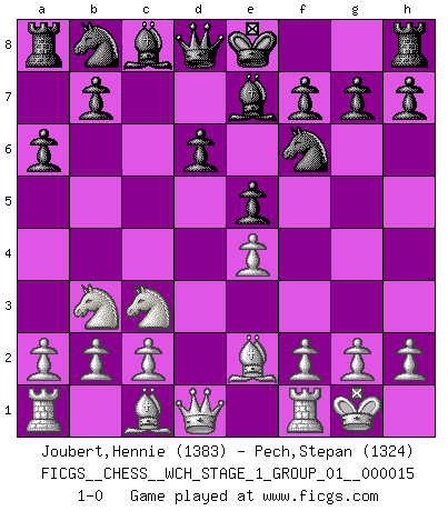 Last move : 1-0 2015 August 15 20:44:59 [Event "FICGS__CHESS__WCH_STAGE_1_GROUP_01__000015"] [Site "FICGS"] [Date "2015.07.02"] [Round "1"] [White "Joubert,Hennie"] [Black "Pech,Stepan"] [Result "1-0"] [WhiteElo "1383"] [BlackElo "1324"] 1.e4 c5 2.Nf3 d6 3.d4 cxd4 4.Nxd4 Nf6 5.Nc3 a6 6.Be2 e5 7.Nb3 Be7 8.O-O 1-0 This chess game has been lost on time (started : 2015.07.02 14:13:21) Sicilian : Najdorf, Opovcensky variation Kingside Castling by player White (move 8) Player White won this chess game. Follow this game move after move (download)We cannot resist the fascination of sacrifice, since a passion for sacrifices is part of a Chessplayer's nature. (Rudolf Spielman) Je mehr ich von der FIDE weiss, um so weniger verstehe ich. (Alexander Kalifman) Para mi, el Ajedrez es la vida y cada partida es como una nueva vida. Todo jugador de Ajedrez suele vivir muchas vidas durante su vida. (Eduard Gufeld) En blitz, le Cavalier l'emporte sur le Fou. (Vlastimil Hort) The production of too many useful things results in too many useless people. (Karl Marx)