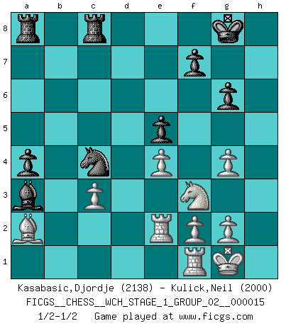 Last move : 1/2-1/2 2015 September 3 16:13:4 [Event "FICGS__CHESS__WCH_STAGE_1_GROUP_02__000015"] [Site "FICGS"] [Date "2015.07.02"] [Round "1"] [White "Kasabasic,Djordje"] [Black "Kulick,Neil"] [Result "1/2-1/2"] [WhiteElo "2138"] [BlackElo "2000"] 1.Nf3 d5 2.d4 Nf6 3.c4 c6 4.Nc3 e6 5.Bg5 h6 6.Bxf6 Qxf6 7.e3 Nd7 8.Bd3 dxc4 9.Bxc4 g6 10.O-O Bg7 11.Rc1 O-O 12.e4 e5 13.d5 Rd8 14.Qe2 Nb6 15.Bb3 Bg4 16.dxc6 bxc6 17.Nd1 a5 18.Ne3 h5 19.Rc3 a4 20.Bc2 Bf8 21.Nxg4 hxg4 22.Ne1 Qe6 23.a3 c5 24.Bb1 c4 25.h3 Qd7 26.hxg4 Qd2 27.Rc2 Qxe2 28.Rxe2 c3 29.bxc3 Nc4 30.Nf3 Bxa3 31.Ba2 Rdc8 1/2-1/2 Reti Opening Kingside Castling by player White (move 10) Kingside Castling by player Black (move 11) This chess game ended in a draw. Follow this game move after move (download)You sit at the board and suddenly your heart leaps. Your hand trembles to pick up the piece and move it. But what Chess teaches you is that you must sit there calmly and think about whether it's really a good idea and whether there are other better ideas. (Stanley Kubrick) Schach ist ein schwarz-weisser Dschungel. (Garry Kasparov) Peones: ellos son el alma de esta partida, solos forman el ataque y la defensa. (Philidor) Soyez une menace à chaque fois que vous vous asseyez pour jouer. (Ken Smith) Horse racing is animated roulette. (Roger Kahn)