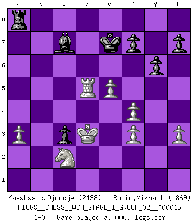 Last move : 1-0 2015 November 27 4:54:50 [Event "FICGS__CHESS__WCH_STAGE_1_GROUP_02__000015"] [Site "FICGS"] [Date "2015.07.02"] [Round "1"] [White "Kasabasic,Djordje"] [Black "Ruzin,Mikhail"] [Result "1-0"] [WhiteElo "2138"] [BlackElo "1869"] 1.e4 e5 2.Nf3 Nc6 3.Bb5 a6 4.Ba4 Nf6 5.O-O b5 6.Bb3 Be7 7.Re1 d6 8.c3 O-O 9.h3 Na5 10.Bc2 c5 11.d4 Qc7 12.Nbd2 cxd4 13.cxd4 Nc6 14.a3 exd4 15.b4 Nd7 16.Bb2 Bf6 17.Rc1 Bb7 18.Bb3 Qb6 19.Bd5 Rac8 20.Nb3 Nce5 21.Nfxd4 Nc4 22.Bxc4 Rxc4 23.Rxc4 bxc4 24.Na5 Ne5 25.Qd2 g6 26.Nc2 Rc8 27.Nxb7 Qxb7 28.Qxd6 Nf3+ 29.gxf3 Bxb2 30.Rb1 Bg7 31.Rd1 c3 32.Kg2 Bf8 33.Qd7 Rc7 34.Qe8 Rc8 35.Rd7 Rxe8 36.Rxb7 a5 37.bxa5 Ra8 38.Rb5 Bd6 39.Kf1 Bc7 40.Rc5 Bxa5 41.f4 Kf8 42.Ke2 Rd8 43.Rd5 Ra8 44.Kd3 Ke7 45.f3 Bc7 46.e5 1-0 Ruy Lopez : 5.O-O Kingside Castling by player White (move 5) Kingside Castling by player Black (move 8) Player White won this chess game. Follow this game move after move (download)Chess opens and enriches your mind. (Saudin Robovic) Ich hatte Angst gegen einen russischen Großmeister zu verlieren, und er befürchtete gegen einen kleinen Jungen zu verlieren. (über ein Remis gegen Juri Awerbach). (Robert James Fischer) Solo existe una cosa que Fischer hace en el Ajedrez sin placer: ¡perder!. (Boris Spassky) Si le désir cupide (et stupide) de gagner est une inépuisable source de souffrance, une combinaison brillante sur l'échiquier est une découverte : le coquelicot qui s'épanouit lorsque apparaît la Voie Lactée. (Arrabal) I've lost money so fast in these clubs it's left me reeling. I've read every poker book ever written, but the only way to get better at the game is to go out and play with people who are really good. The problem is, you stand to lose a lot of money doing it. (Matt Damon)