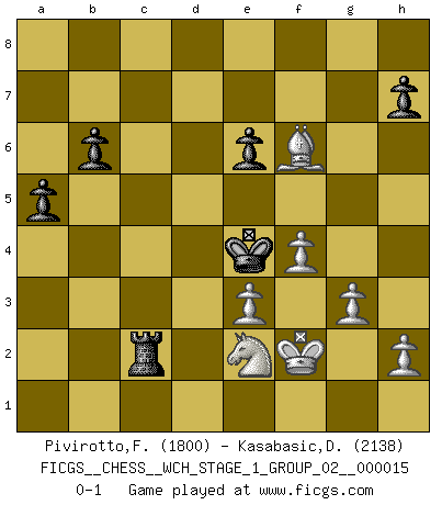 Last move : 0-1 2015 October 29 21:13:32 [Event "FICGS__CHESS__WCH_STAGE_1_GROUP_02__000015"] [Site "FICGS"] [Date "2015.07.02"] [Round "1"] [White "Pivirotto,Filiberto"] [Black "Kasabasic,Djordje"] [Result "0-1"] [WhiteElo "1800"] [BlackElo "2138"] 1.b3 Nf6 2.Bb2 d5 3.e3 c5 4.Nf3 Nc6 5.Bb5 Bd7 6.O-O e6 7.c4 a6 8.Bxc6 Bxc6 9.Ne5 Rc8 10.d3 Be7 11.f4 dxc4 12.dxc4 Qxd1 13.Rxd1 Be4 14.Nc3 Bf5 15.Rd2 Ne4 16.Nxe4 Bxe4 17.Nd7 f6 18.Nb6 Rd8 19.Rad1 Bc2 20.Rxd8+ Bxd8 21.Rd2 Bxb3 22.Rxd8+ Kxd8 23.axb3 Kc7 24.Na4 Rd8 25.Bc3 Rd1+ 26.Kf2 Kc6 27.b4 cxb4 28.Bxb4 Rc1 29.Nc3 b6 30.g3 a5 31.Ne2 Rxc4 32.Bf8 Kd5 33.Bxg7 Ke4 34.Bxf6 Rc2 0-1 Nimzovich-Larsen attack : Indian variation Kingside Castling by player White (move 6) Player Black won this chess game. Follow this game move after move (download)When you don't know what to do, wait for your opponent to get an idea - it's sure to be wrong. (Tarrasch) Ich habe kein Problem mit Frauen, sondern nur mit dem Niveau ihres Schachspiels (Judith Polgar) Fischer sacrificó virtualmente todo lo que la mayoría de nosotros los 'debiles' (término que él usa) valoramos, respetamos y apreciamos por el amor de un astuto, a menudo hermoso tablero de juego, por el privilegio ambivalente de ser su mas grande maestro. (Paul Kollar) Fischer est le meilleur joueur du monde et Karpov n'est qu'un joueur de bistrot. (Garry Kasparov, agé de 16 ans) I find television to be very educating. Every time somebody turns on the set, I go in the other room and read a book. (Groucho Marx)