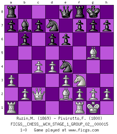 Last move : 1-0 2015 August 23 20:50:16 [Event "FICGS__CHESS__WCH_STAGE_1_GROUP_02__000015"] [Site "FICGS"] [Date "2015.07.02"] [Round "1"] [White "Ruzin,Mikhail"] [Black "Pivirotto,Filiberto"] [Result "1-0"] [WhiteElo "1869"] [BlackElo "1800"] 1.d4 Nf6 2.c4 e6 3.Nc3 Bb4 4.Qc2 O-O 5.a3 Bxc3+ 6.Qxc3 b6 7.Nf3 Bb7 8.Bg5 d6 9.e3 Nbd7 10.Be2 Qe8 11.O-O Ne4 12.Qc2 1-0 Nimzo-Indian : Classical variation Kingside Castling by player Black (move 4) Kingside Castling by player White (move 11) Player White won this chess game. Follow this game move after move (download)Why must I lose to this idiot ? (Aron Nimzovich) Man wirke der falschen Auffassung entgegen, als ob jeder Zug Unmittelbares zu leisten habe; auch Werte- und Ruhezüge haben ihre Existenzberechtigung. (Aaron Nimzowitsch) Yo he agregado estos principios a la ley: pongan los Caballos en acción antes de que los dos Alfiles sean desarrollados. (Emanuel Lasker) Psychologiquement, tu dois avoir confiance en toi même, mais cette confiance doit être basée sur des faits. (Robert Fischer) What doesn't kill us makes us stronger. (Friedrich Nietzsche)